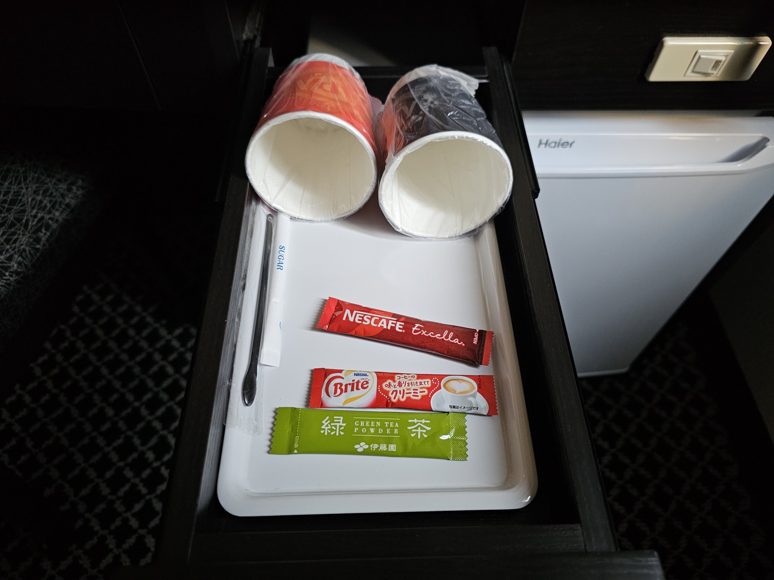 Der er også en køleautomat i receptionen (kun kontanter), men det er mere sandsynligt, at du vil bruge Lawsons minimarked lige over for hotellet, som er åbent døgnet rundt og også kan betales med kort.