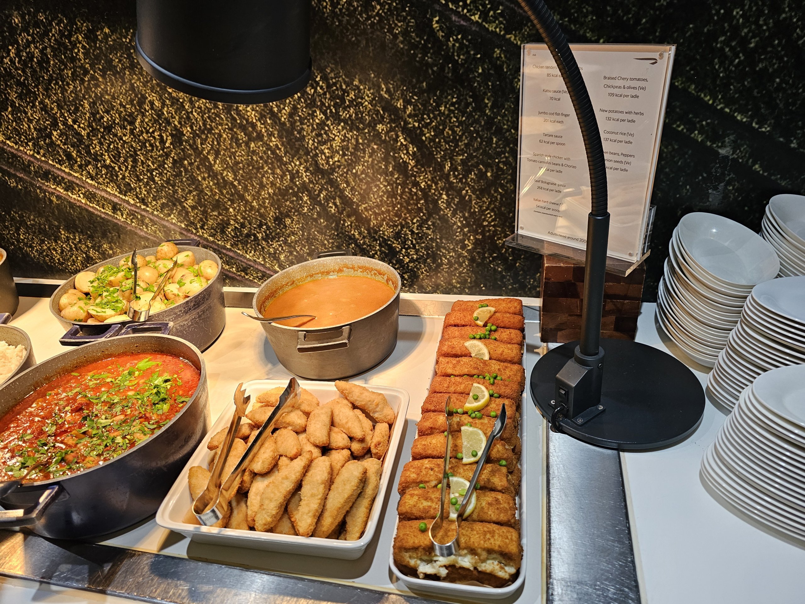 Menuen med kold mad omfatter nogle få grøntsager, en salat med et udvalg af forskellige dressinger og et meget begrænset og svagt udvalg af bagværk (stort set kun sødt).