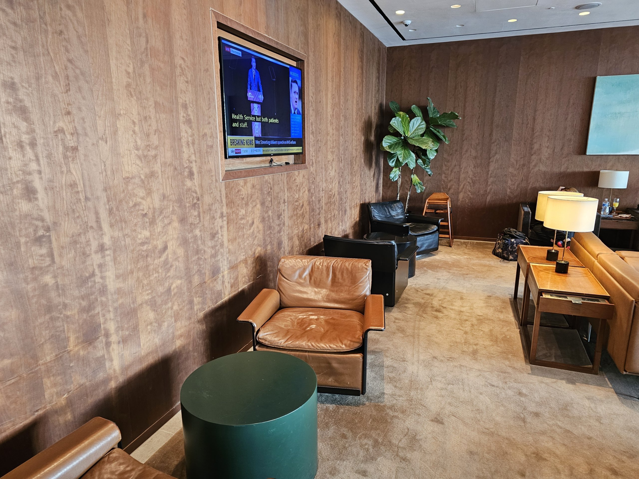 Loungen ligger 1 minuts gang fra sikkerhedskontrollen mellem loungerne ved siden af Qantas-loungen (yderst til venstre).