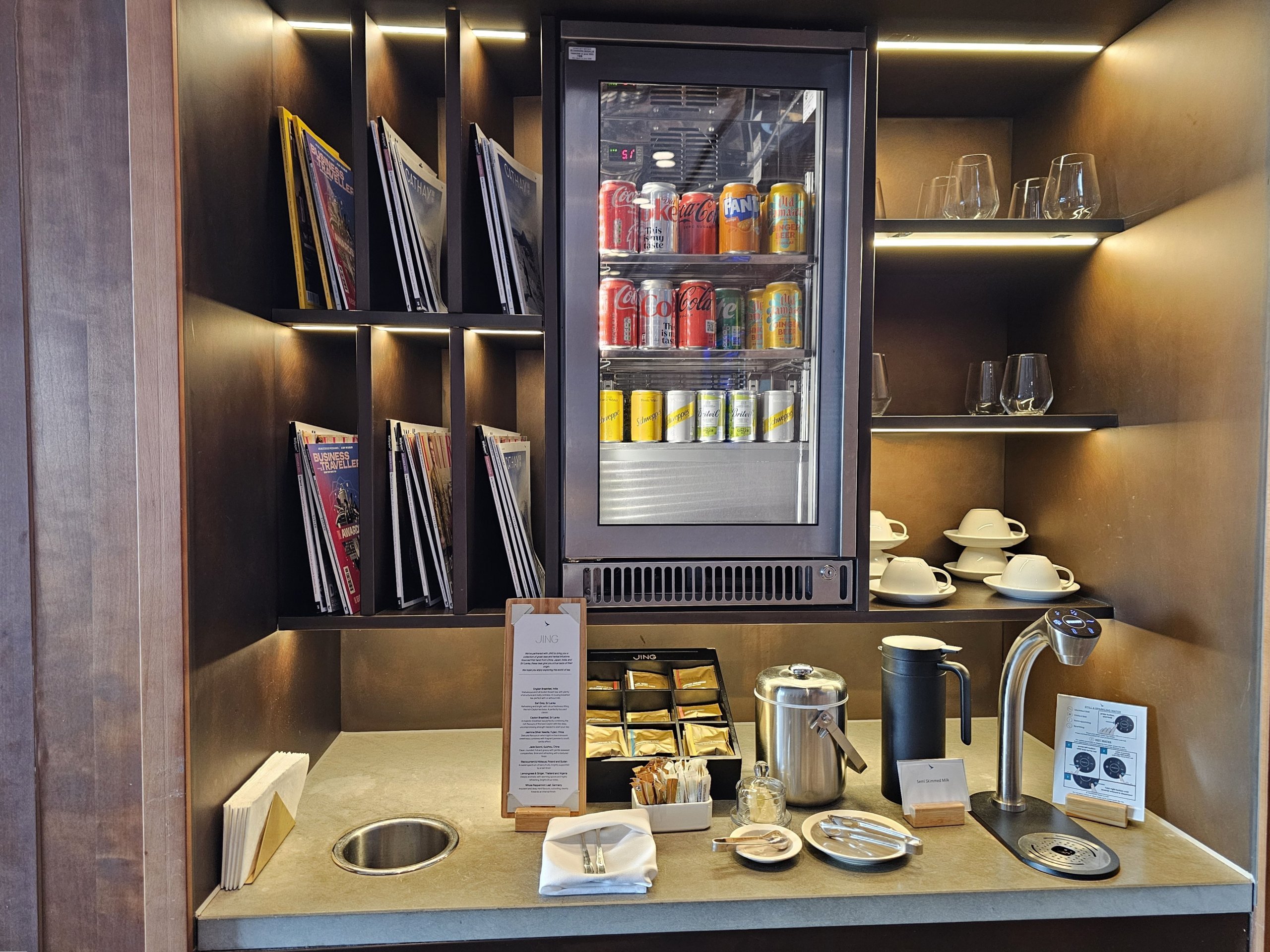 Der er kaffemaskiner forskellige steder i loungen og et ret omfattende udvalg af Jing-te.