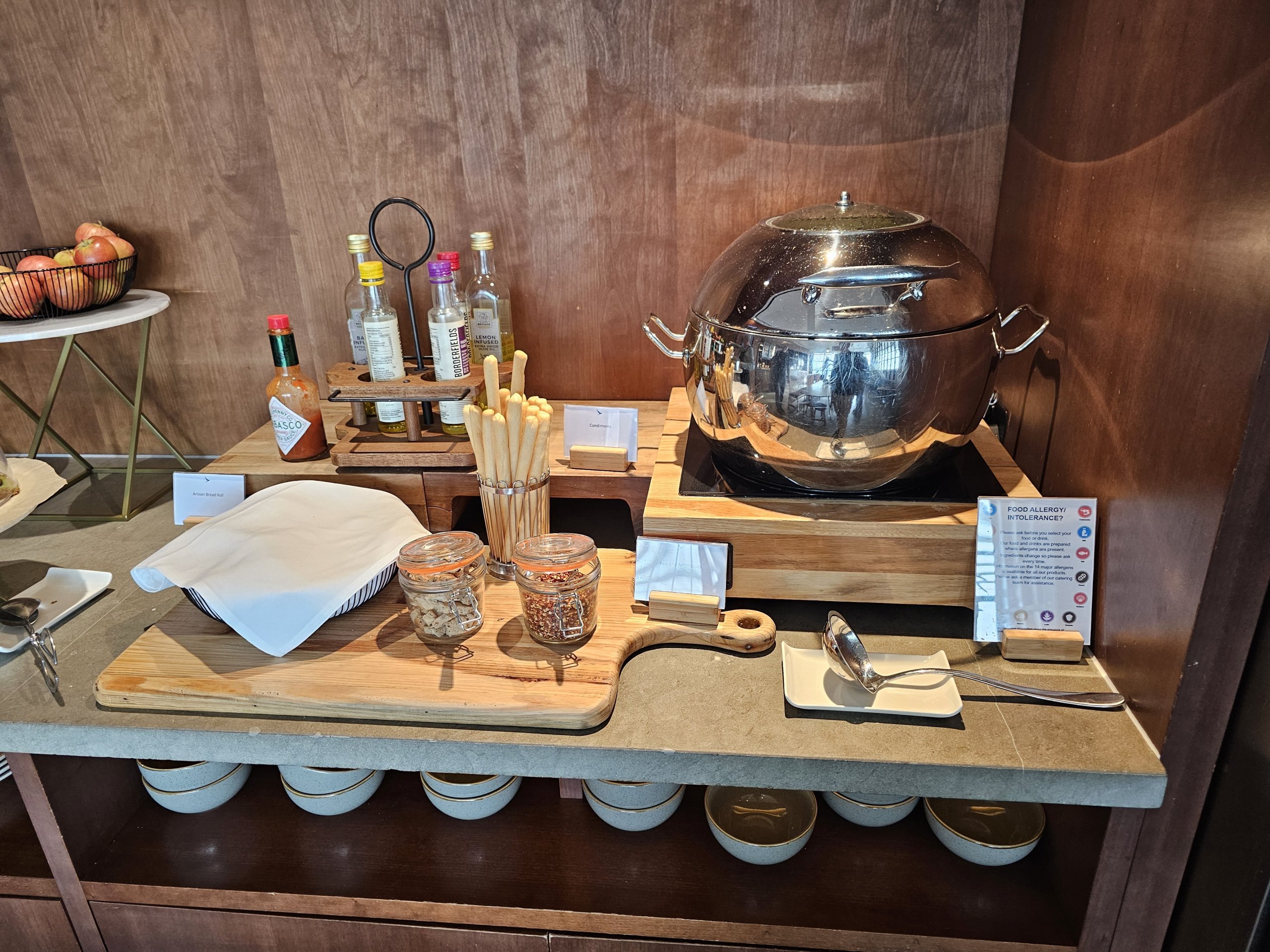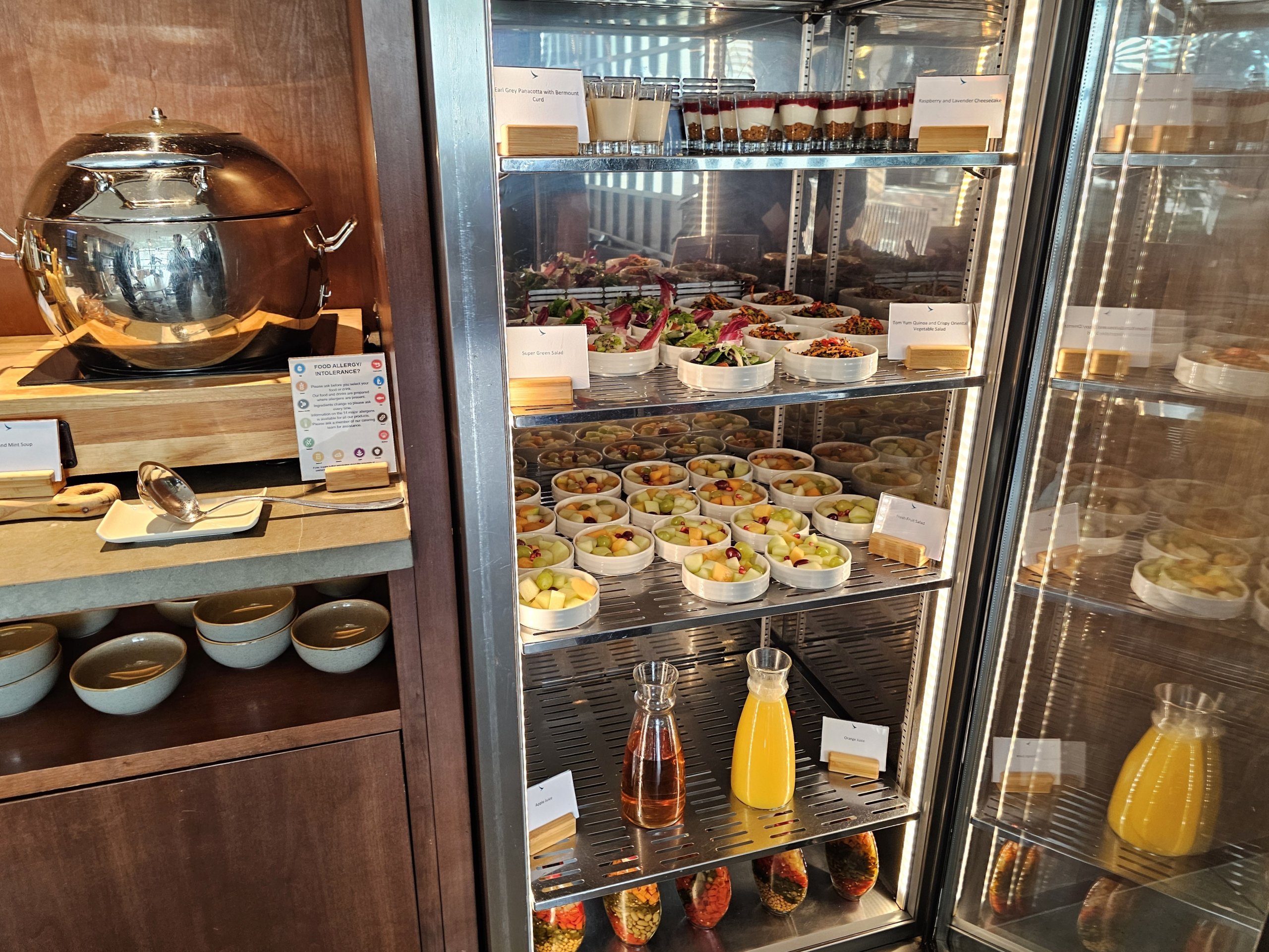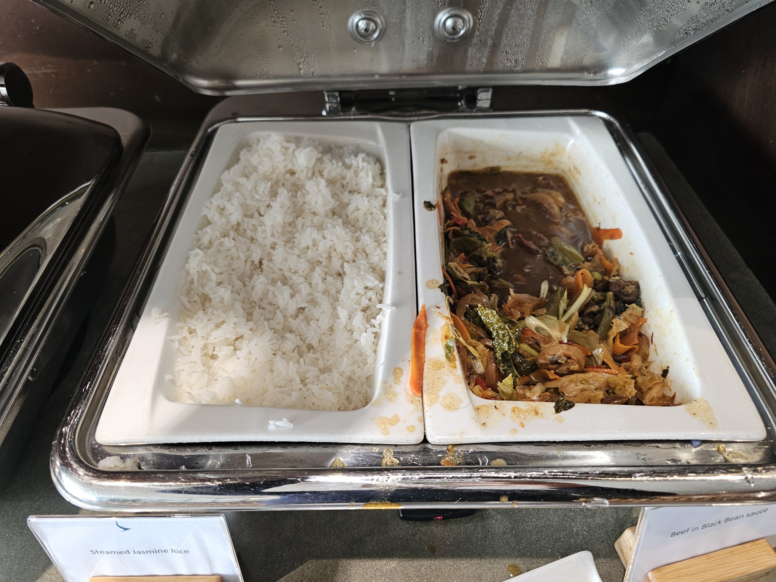 I en anden del af loungen finder man den klassiske buffet - der er altid et udvalg af 4 typer varm mad. Vi var først i loungen om eftermiddagen, så jeg ved ikke, hvordan morgenmadsudbuddet er.