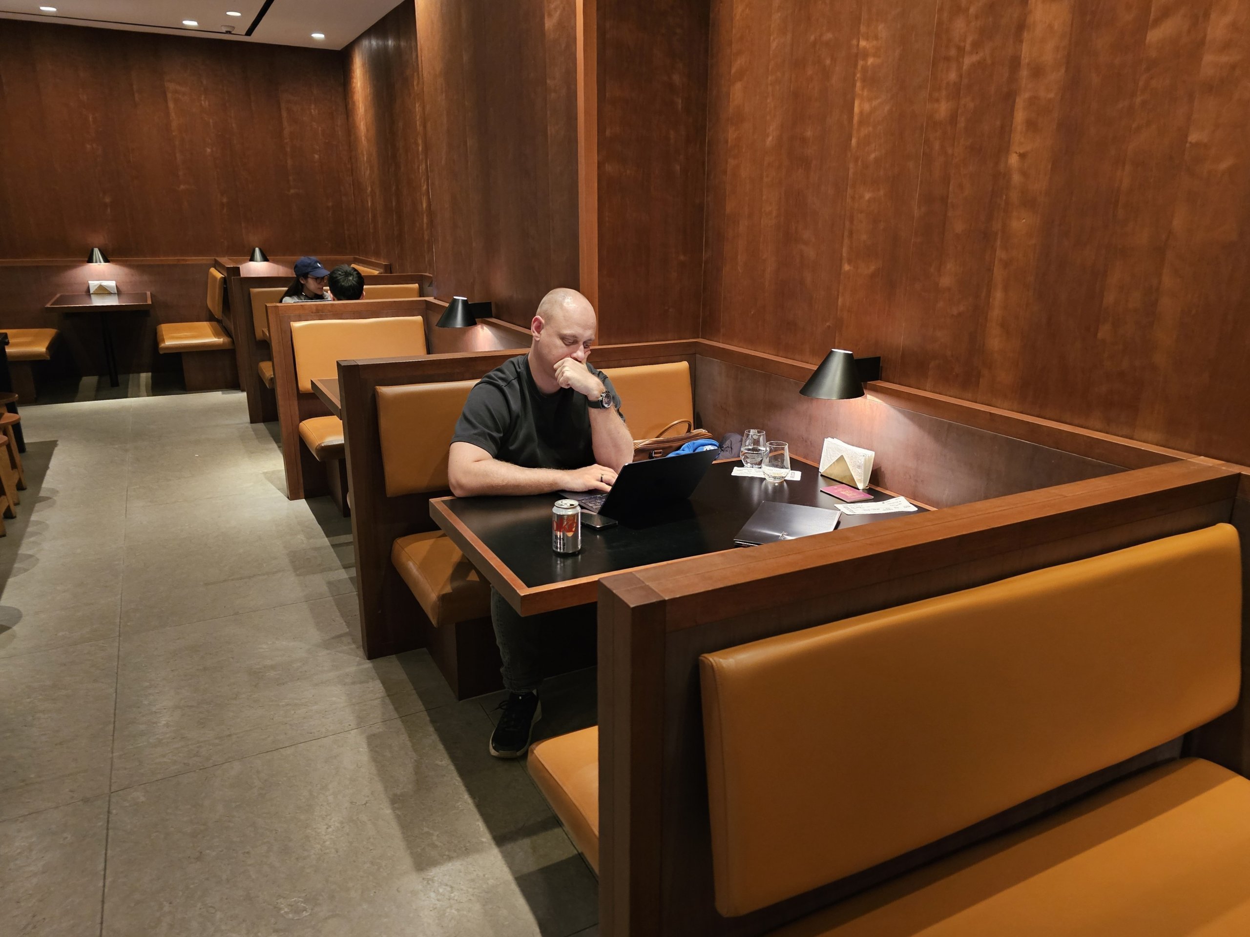 Ja, David og jeg blev enige om, at Cathay Pacific Lounge er den bedste på LHR T3. Mest på grund af nudelbaren! :D
