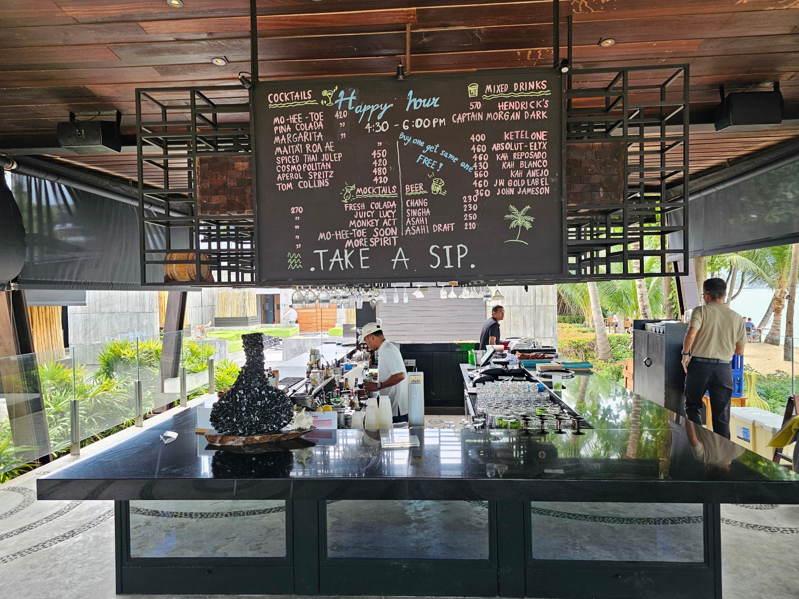 Standardbaren suppleres af en stor cirkulær "pool" med sofaer, der er sunket næsten ned under overfladen, og bogstavet "W". En betagende udsigt over havet og den nærliggende ø Koh Phangan fuldender stemningen.