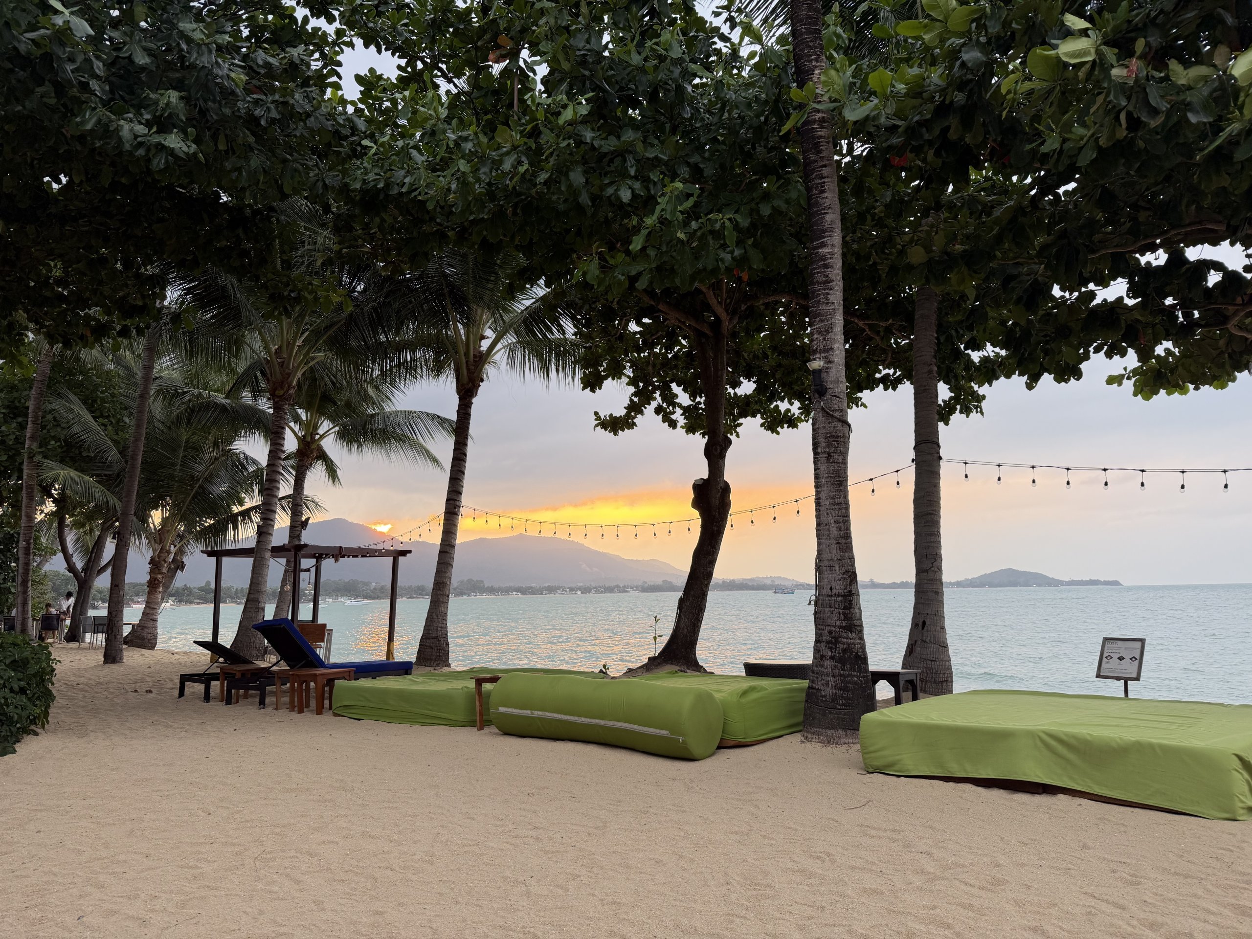 Fra stranden kan du se spektakulære solnedgange over Koh Samuis bjerge.