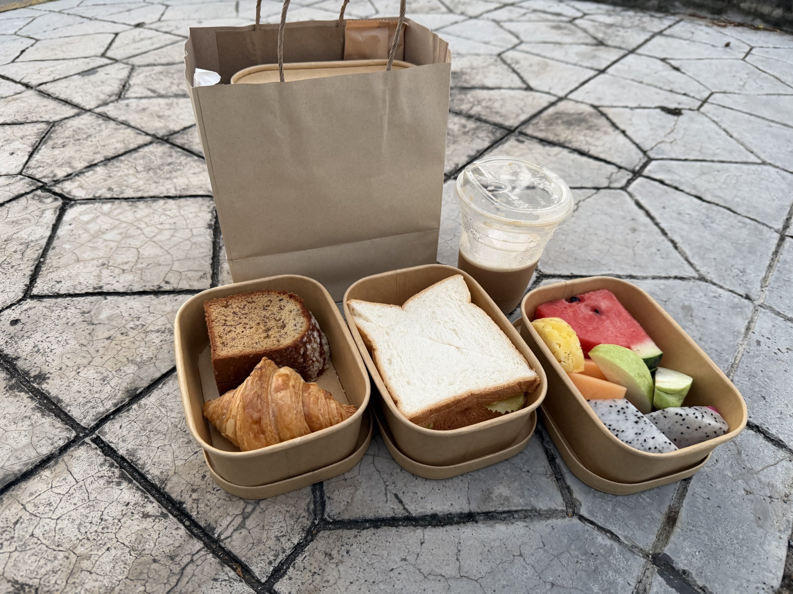 Receptionen tilbød os muligheden for en takeaway-morgenmadskasse på egen hånd. Pakken indeholdt kaffe, to stykker toastbrød og frugt. Ret basalt, men rigeligt til en tidlig morgen og en meget fin gestus.