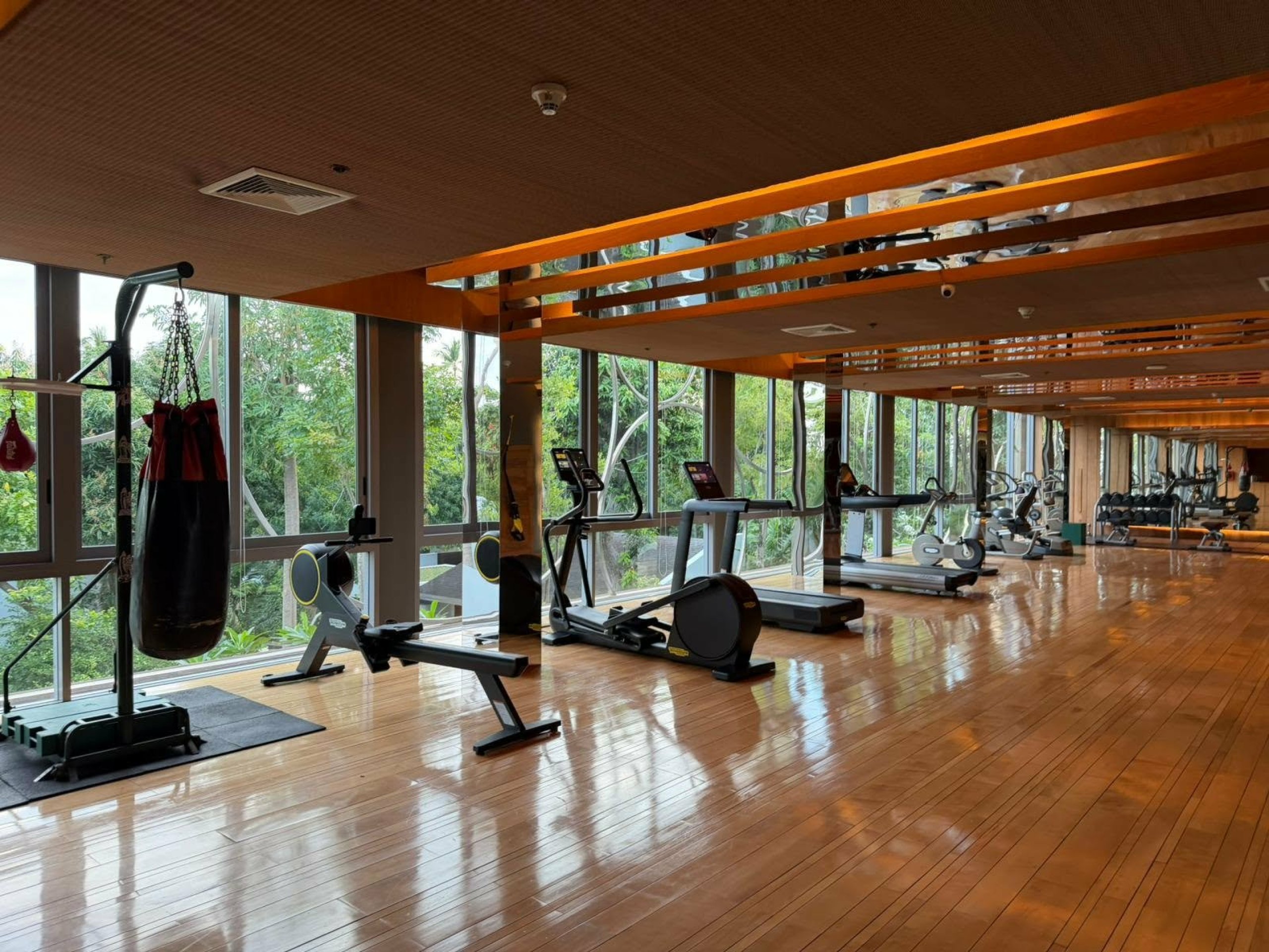 En etage under poolen finder du et ret stort fitnesscenter, som er tilgængeligt 24/7.