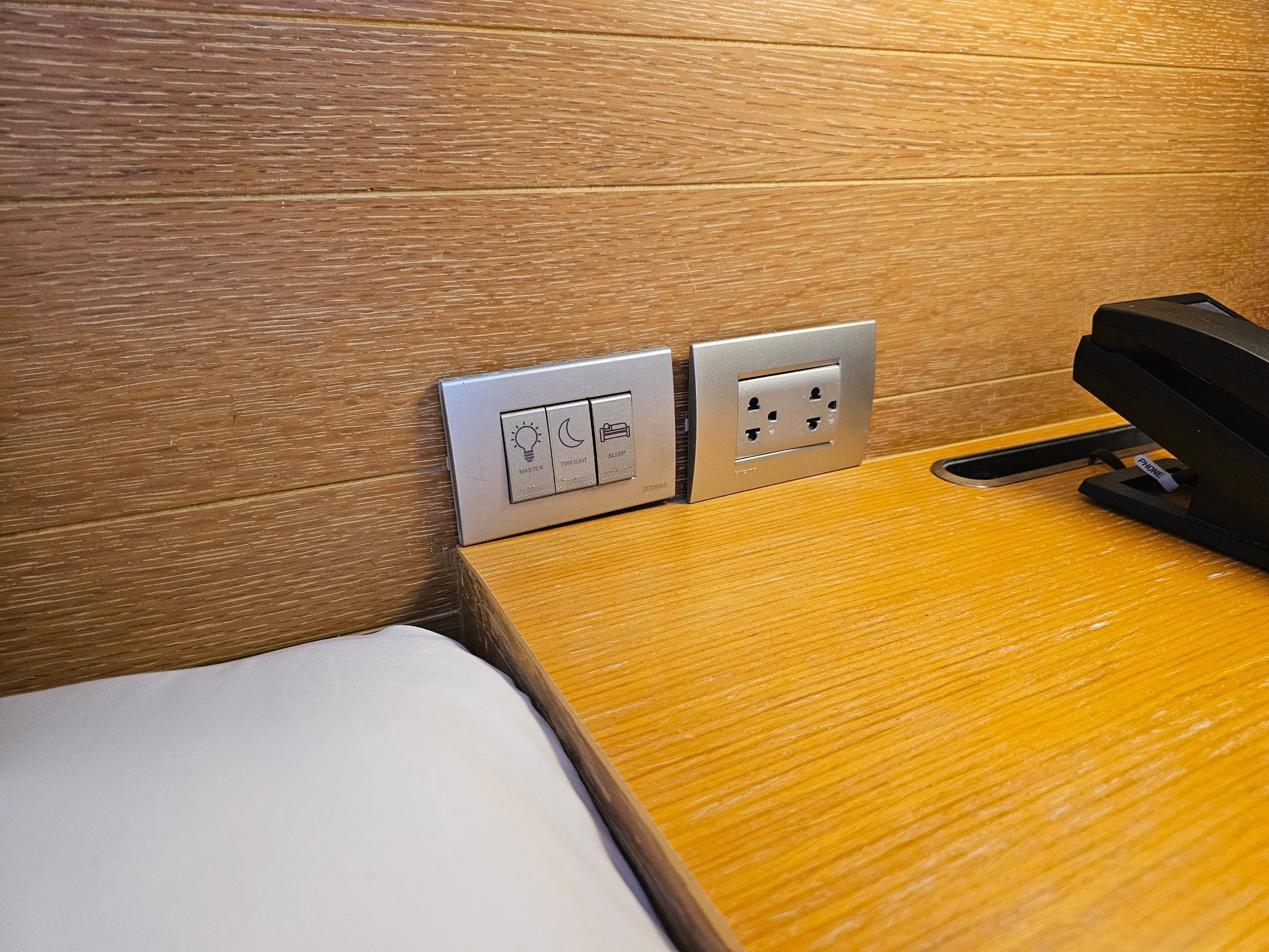 På den anden side var jeg skuffet over, at der ikke er nogen klimakontrol eller USB-stik lige ved siden af sengen, men kun klassiske universalstik.