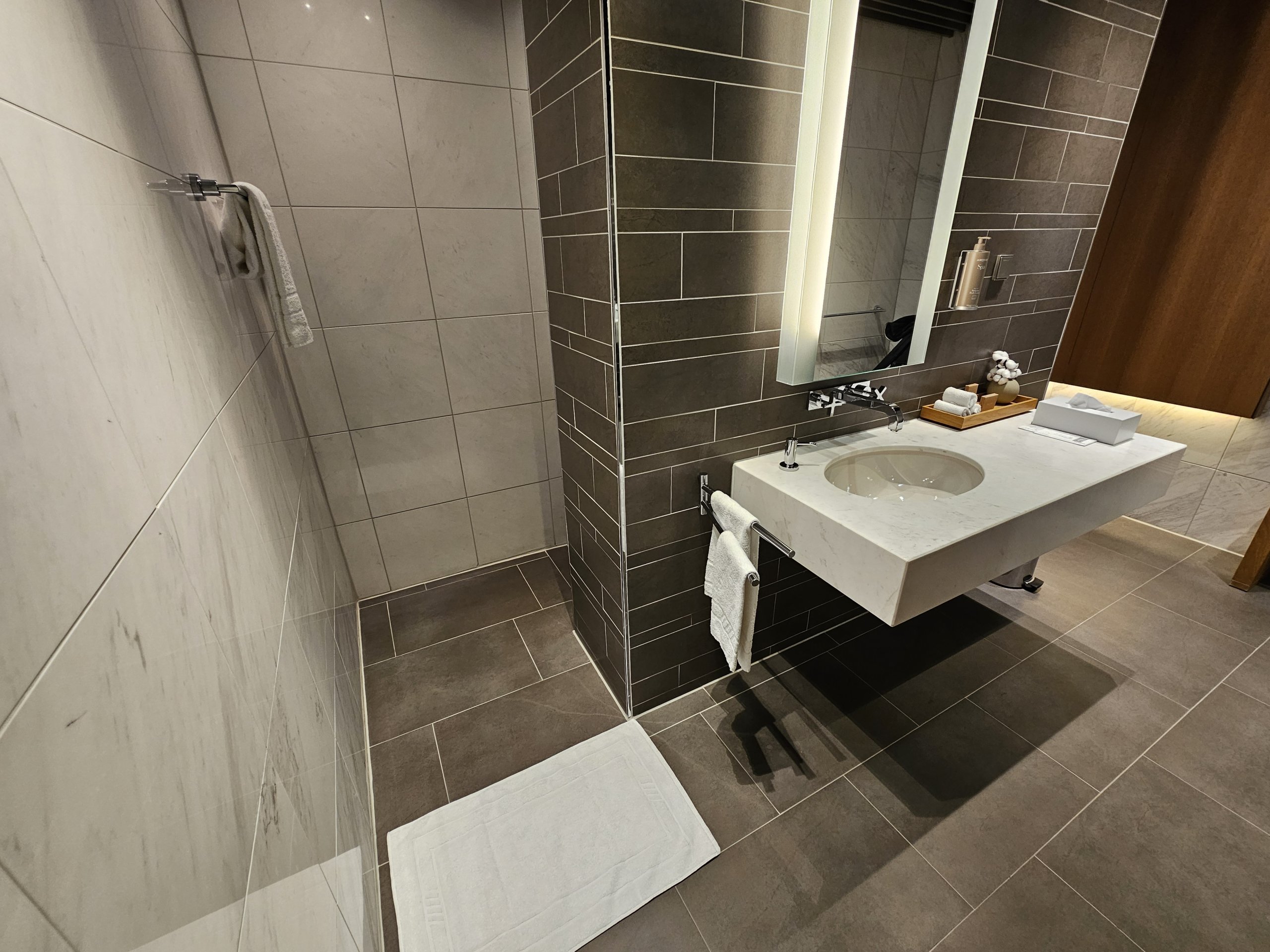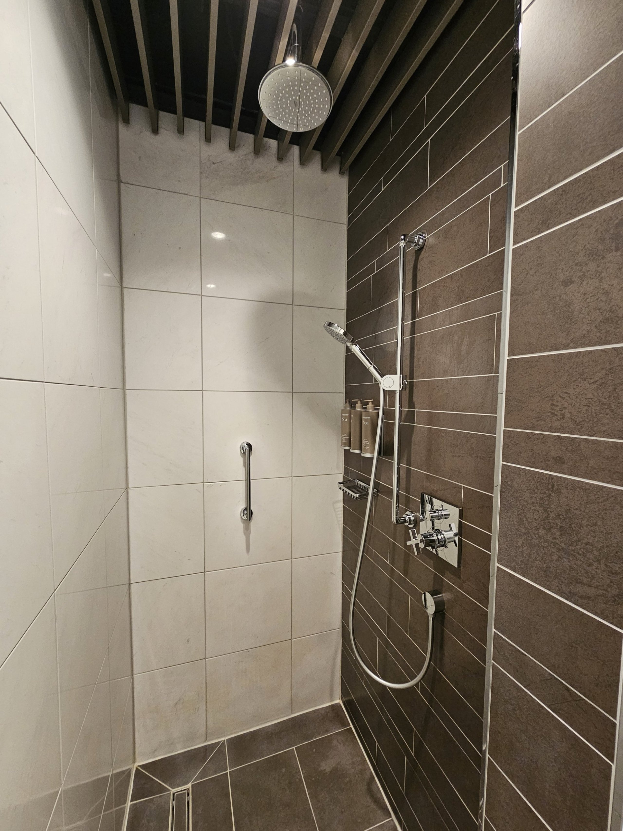 Efter en lang flyvetur på 14 timer er et dejligt stort og rent brusebad også praktisk.