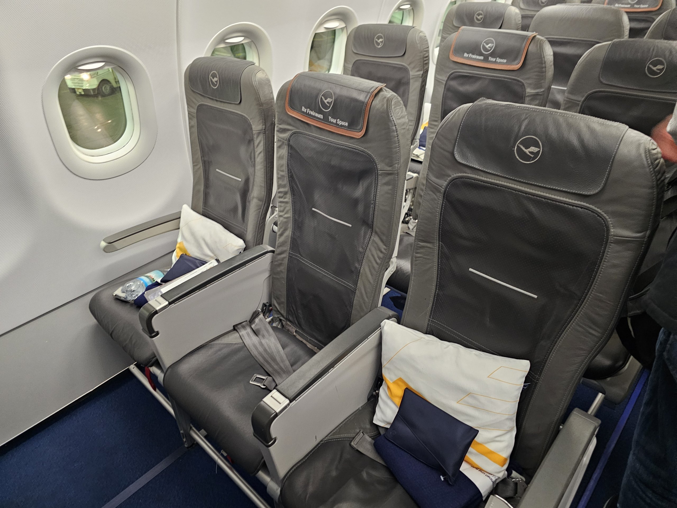 Lufthansas regionale business class på flåden af smalskrogede Airbus A32S-fly er velkendt - standard økonomiklassesæder med et garanteret ubesat midtersæde.