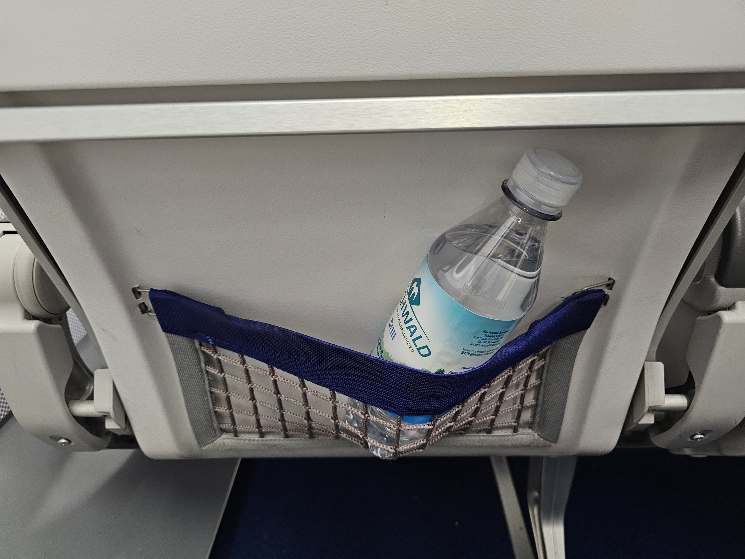 Der er ingen velkomstdrink før afgang. Den erstattes kun af en 0,5 liters flaske vand i et net ved sædet.