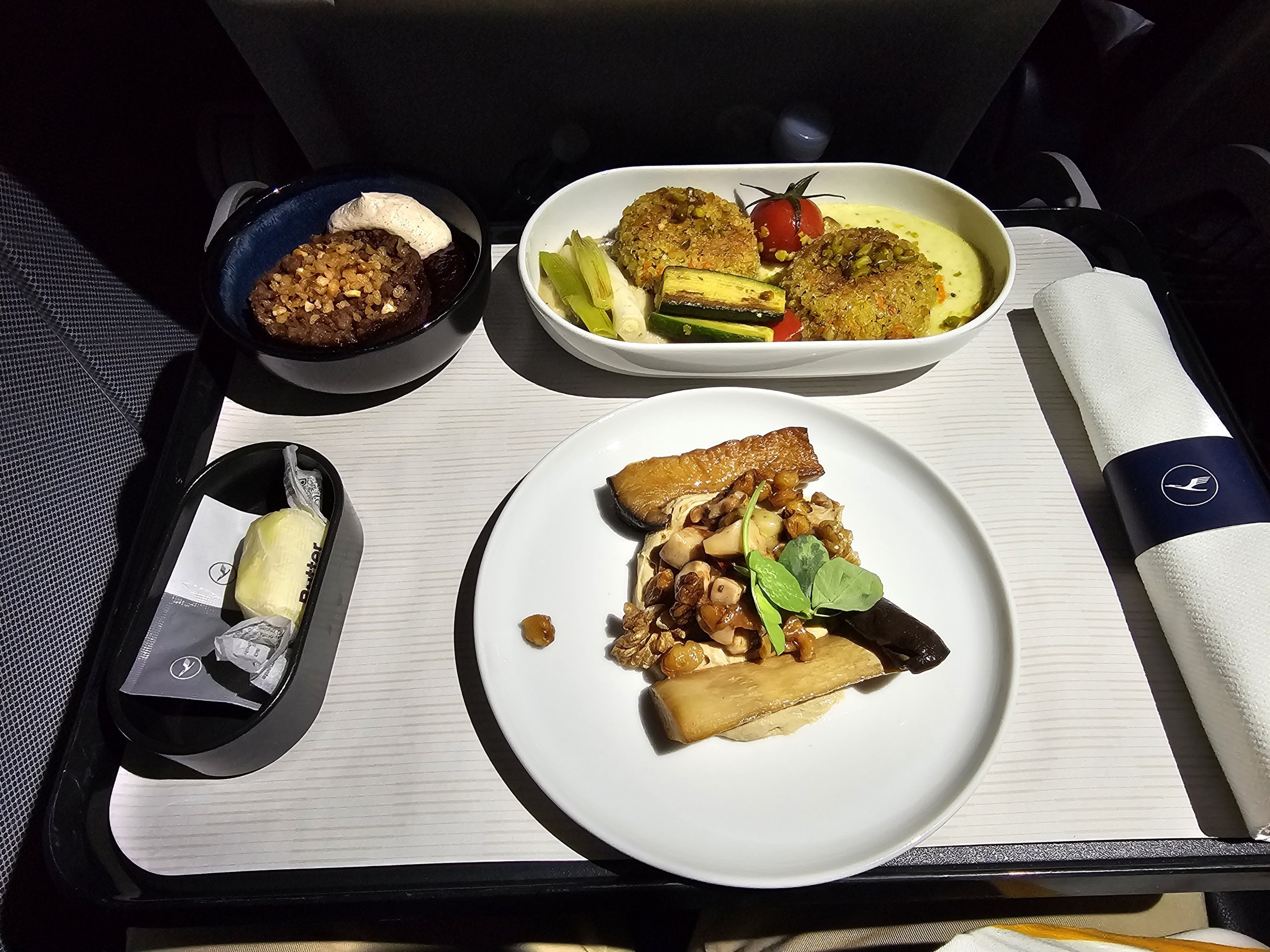 Jeg har fået bedre måltider på flyet, quinoaen er tørret og med brødkrummer, så måltidet er ikke så let, som jeg havde forventet. Men svampeforretten er fantastisk, og blommecrumblen er også lækker,