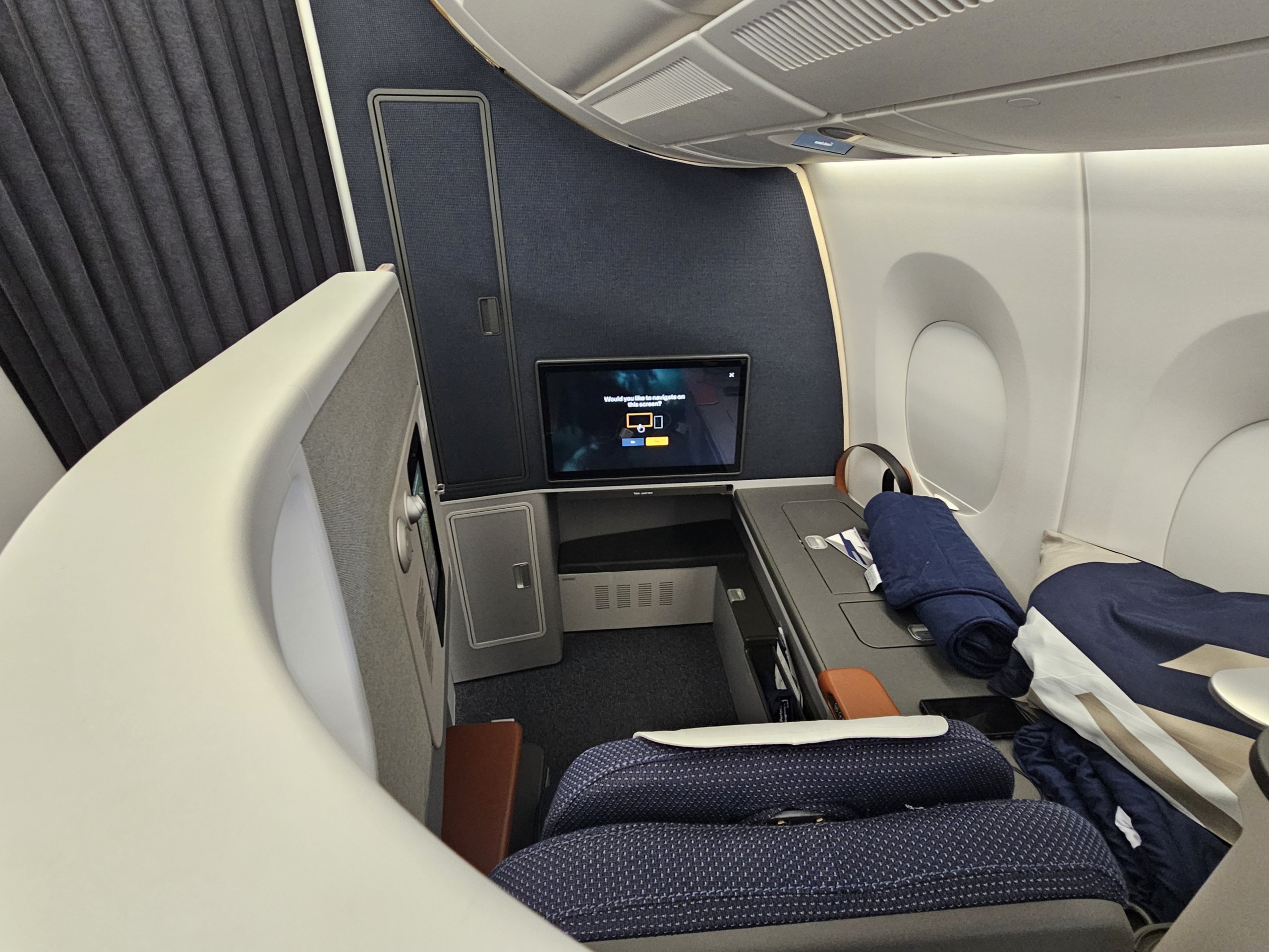 Vi flyver med en Airbus A350-900, som kun er et par måneder gammel, og business class-kabinen ser ny og moderne ud ved første øjekast.