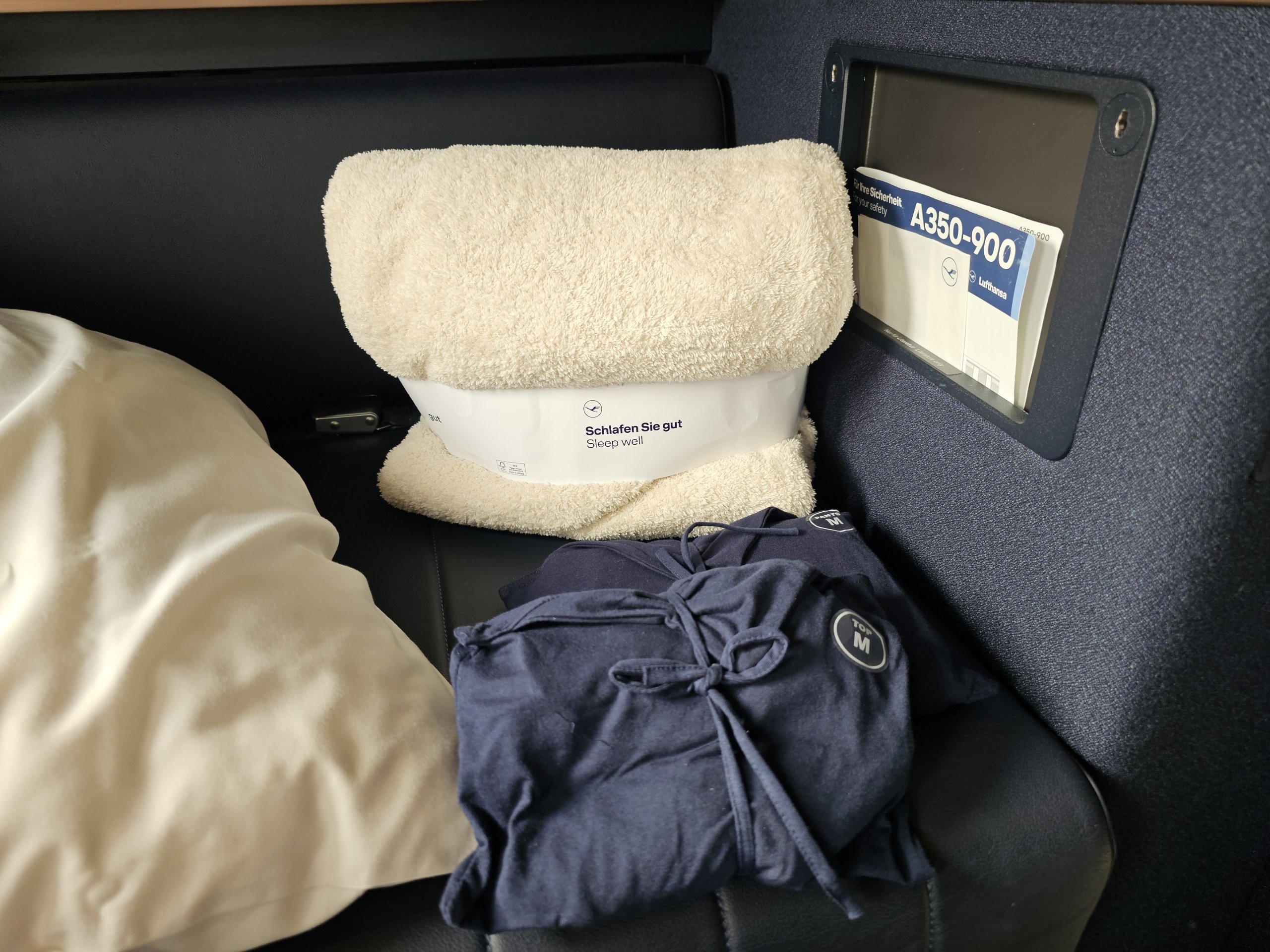 Kort efter take-off får jeg stadig udleveret en pyjamas - der er 3 størrelser til rådighed: M, L og XL.