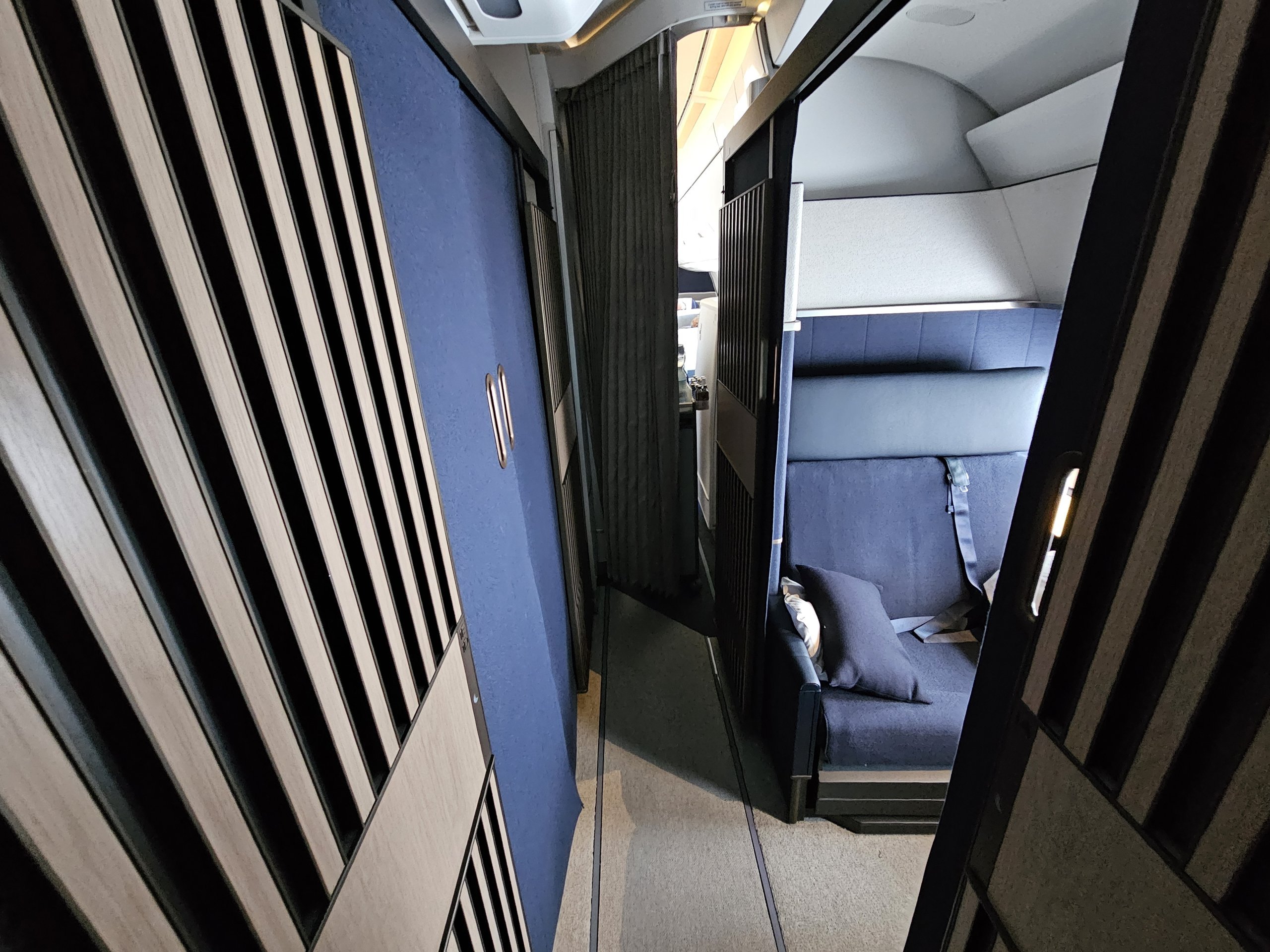 Så kort efter frokost går jeg på toilettet for at skifte til min pyjamas. I mellemtiden gør en hjælpsom steward min seng klar (man kan selv folde sædet ud med et tryk på en knap, men lagnerne og tæppet er placeret i rum, som kun besætningen har adgang til).
