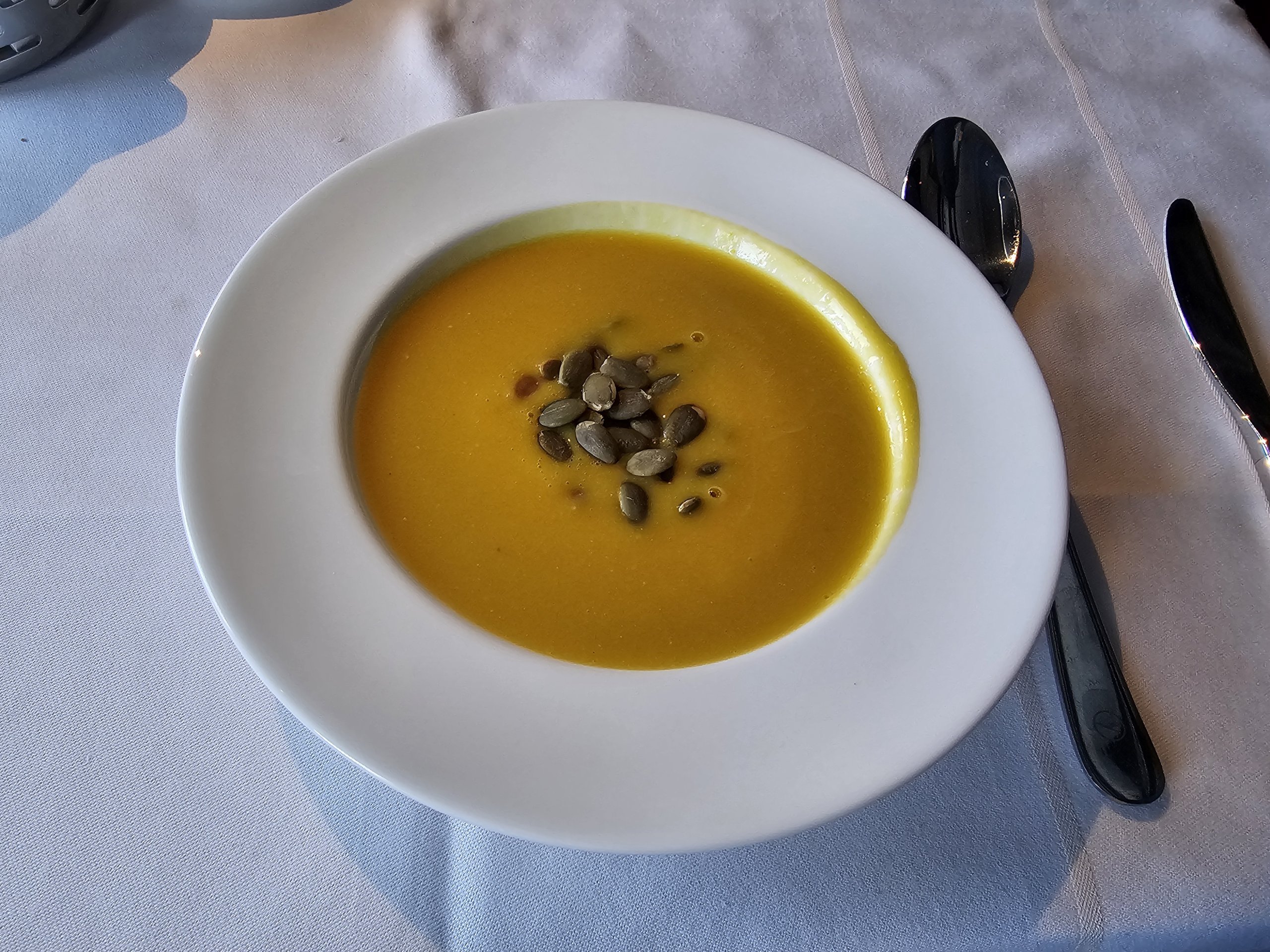 Jeg får en god græskar- og ingefærsuppe før mit måltid.