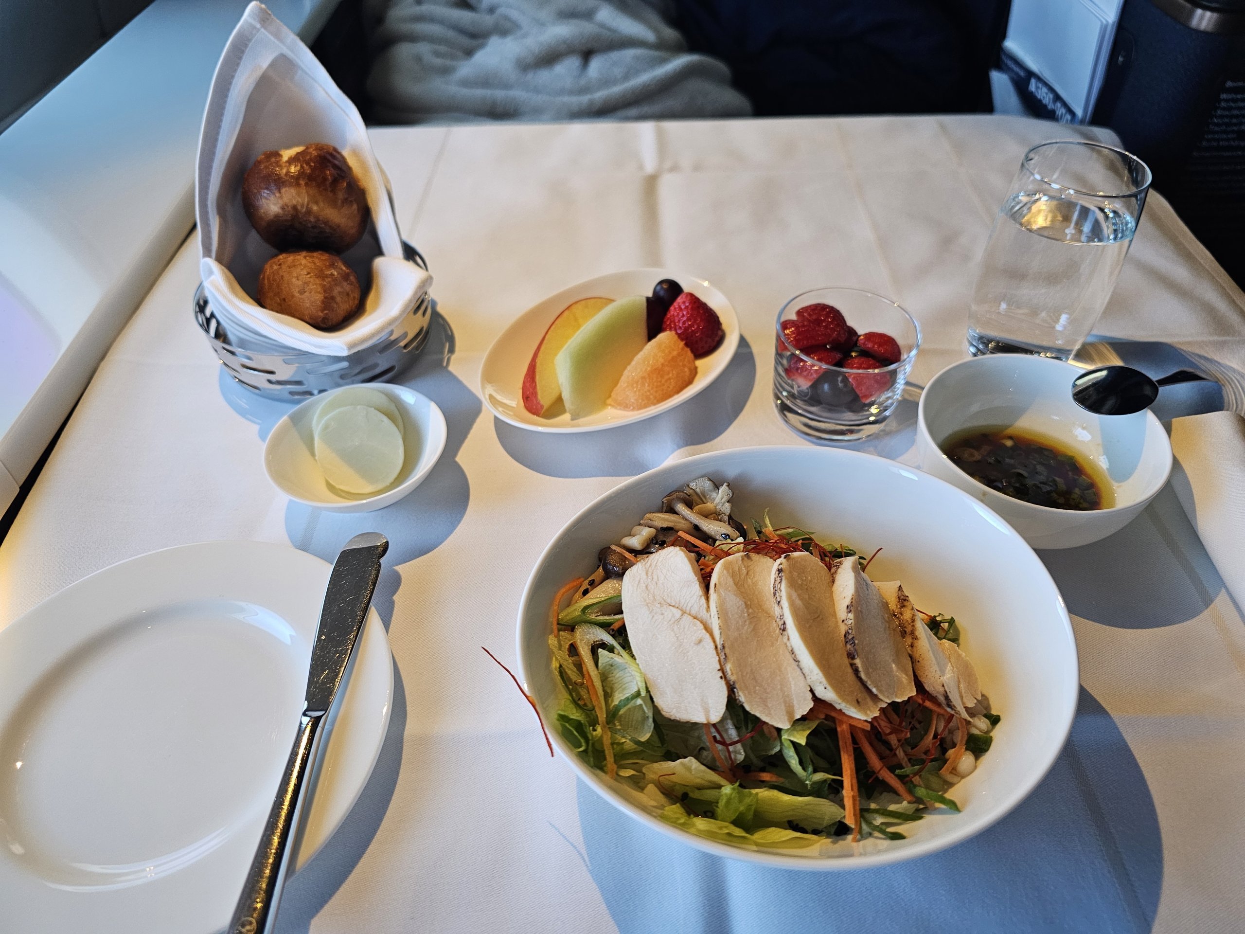 Forretten er meget frisk, farverig, let og fantastisk! Jeg kan godt lide præsentationen, og sammenlignet med business class-service er maden mere rigelig og meget mere varieret.