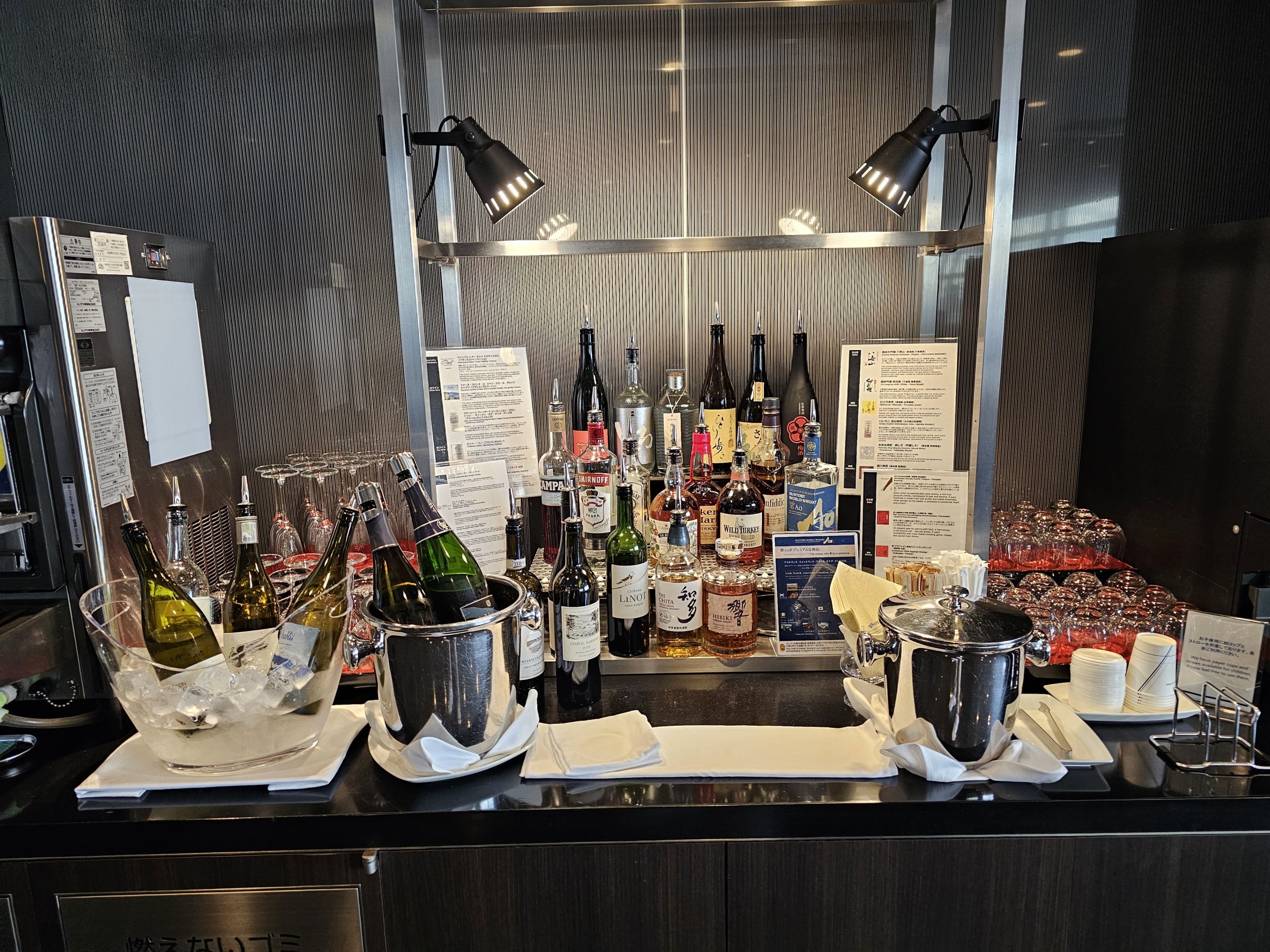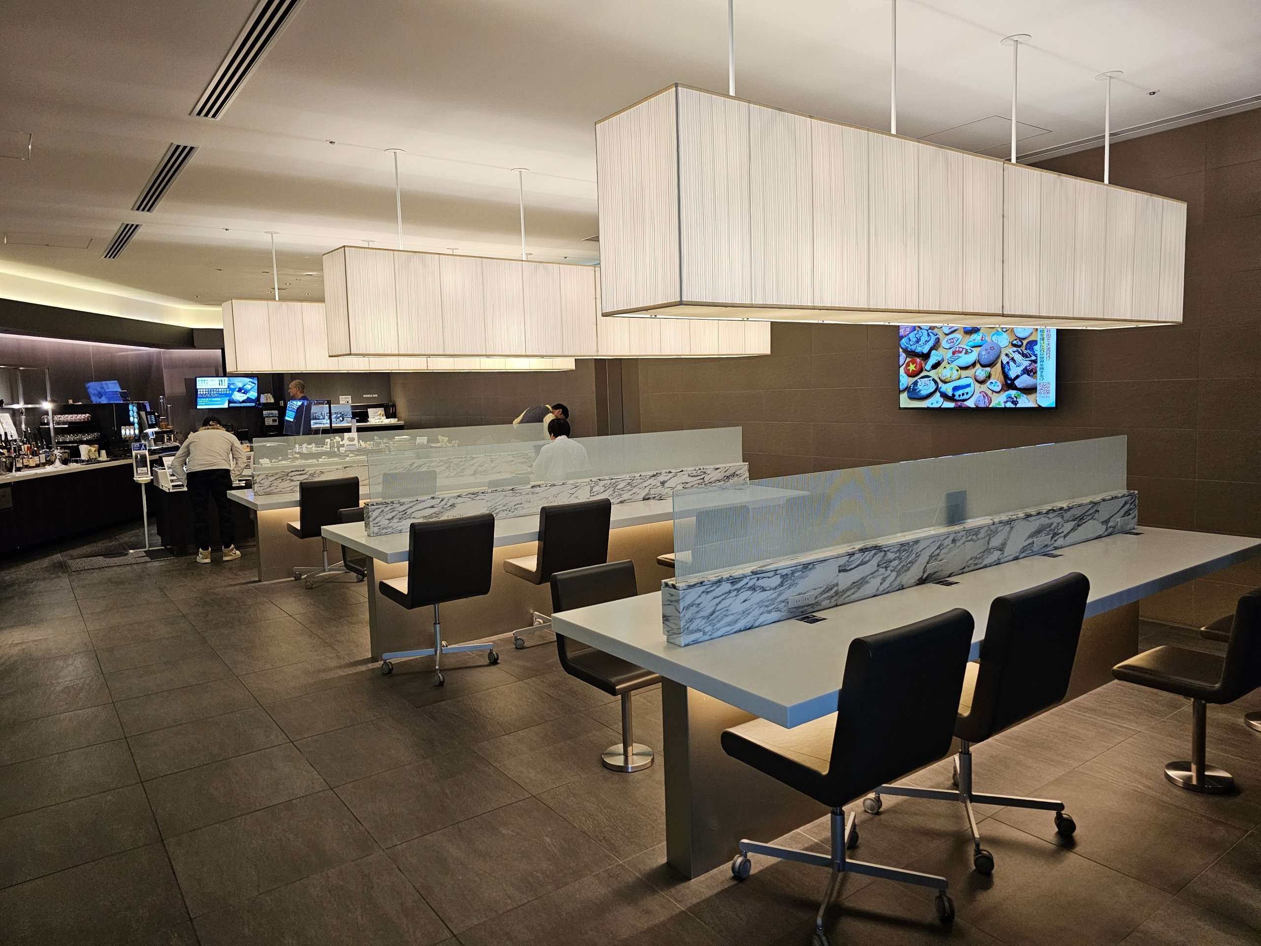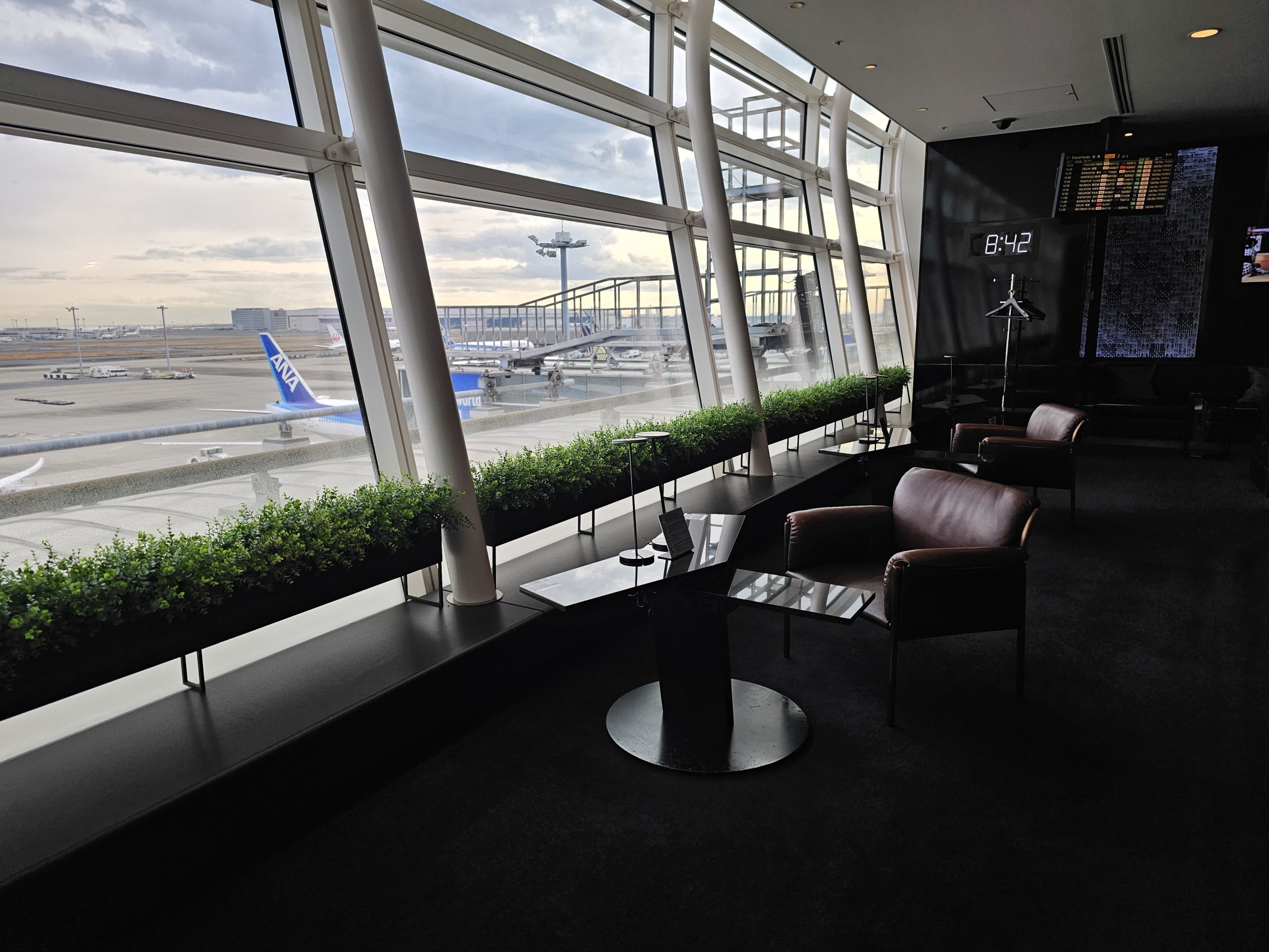 Loungen er meget rummelig med en fantastisk udsigt over asfalten og masser af kabiner, der efterligner førsteklasses sæderne på ANA Japan Airlines.