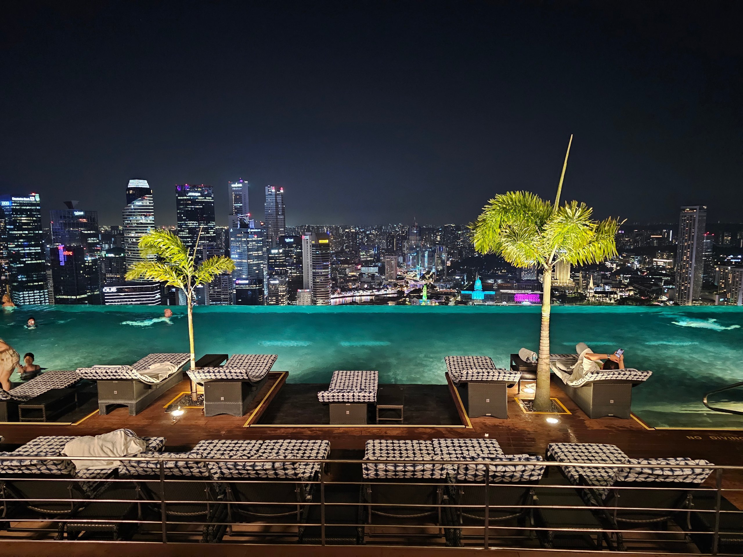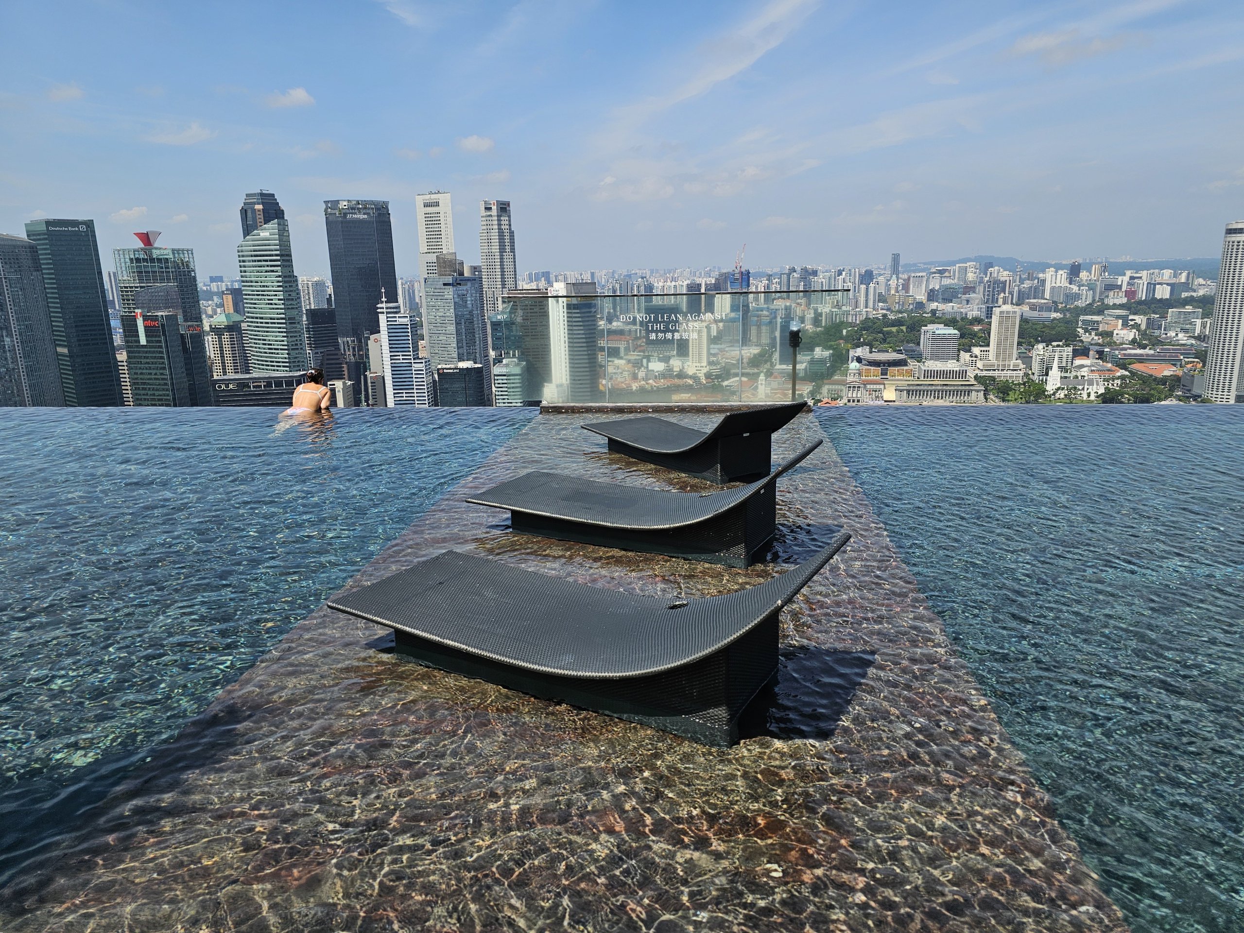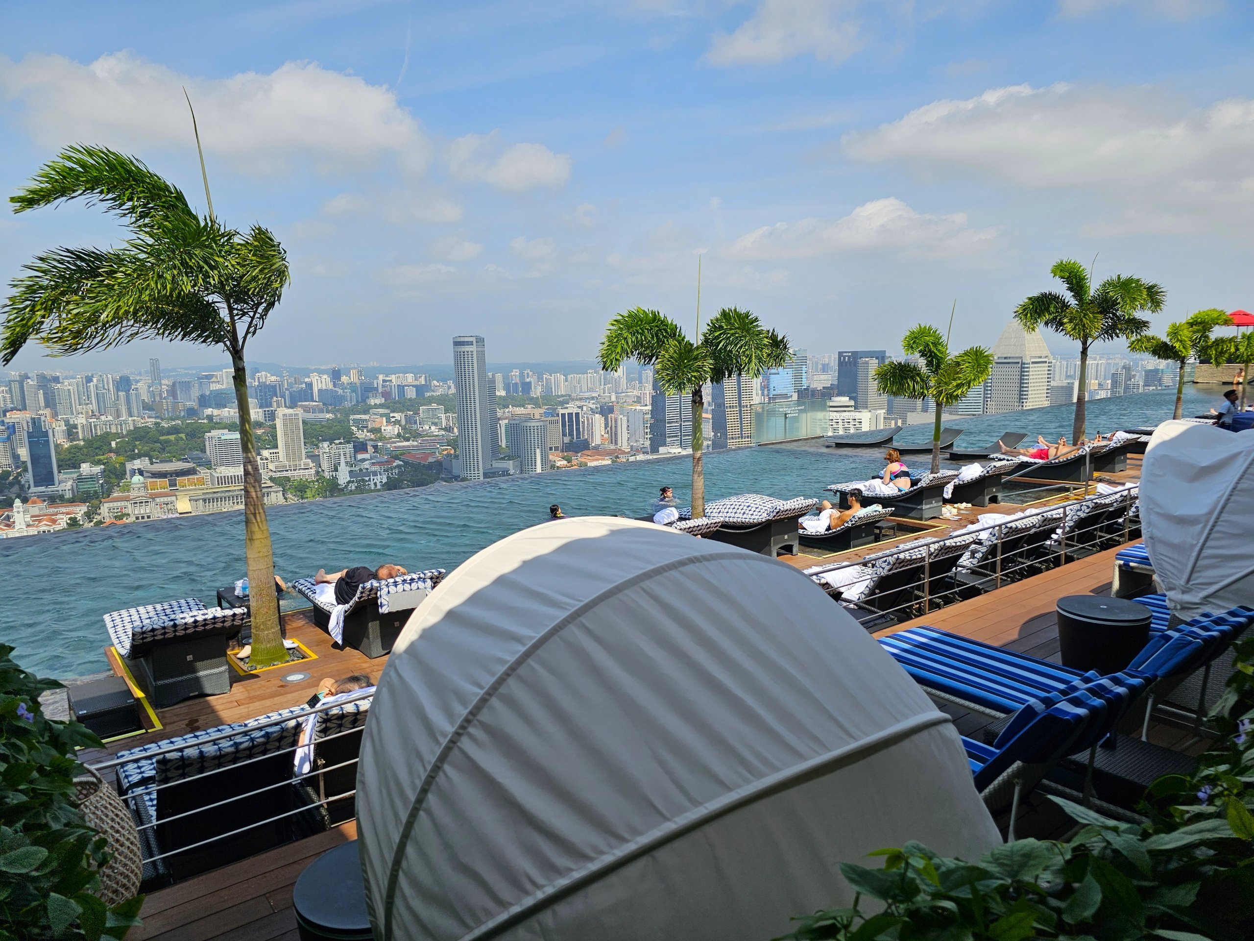 Fra poolens længde har man Singapores centrum i sin hule hånd. Og hvis man går om på den anden side af taget, kan man se Gardens by the Bay og hundredvis af fragtskibe i baggrunden på åbent hav.