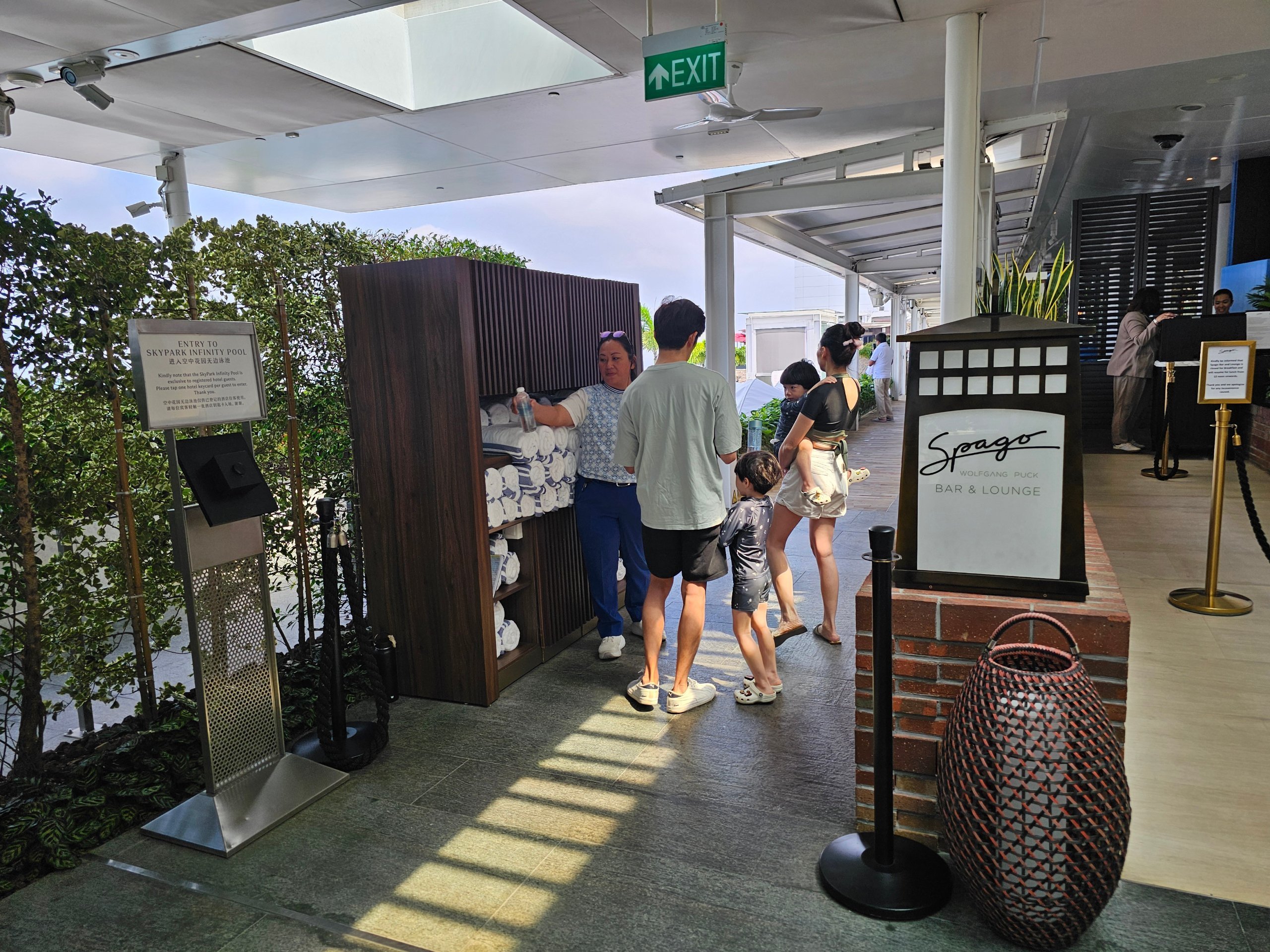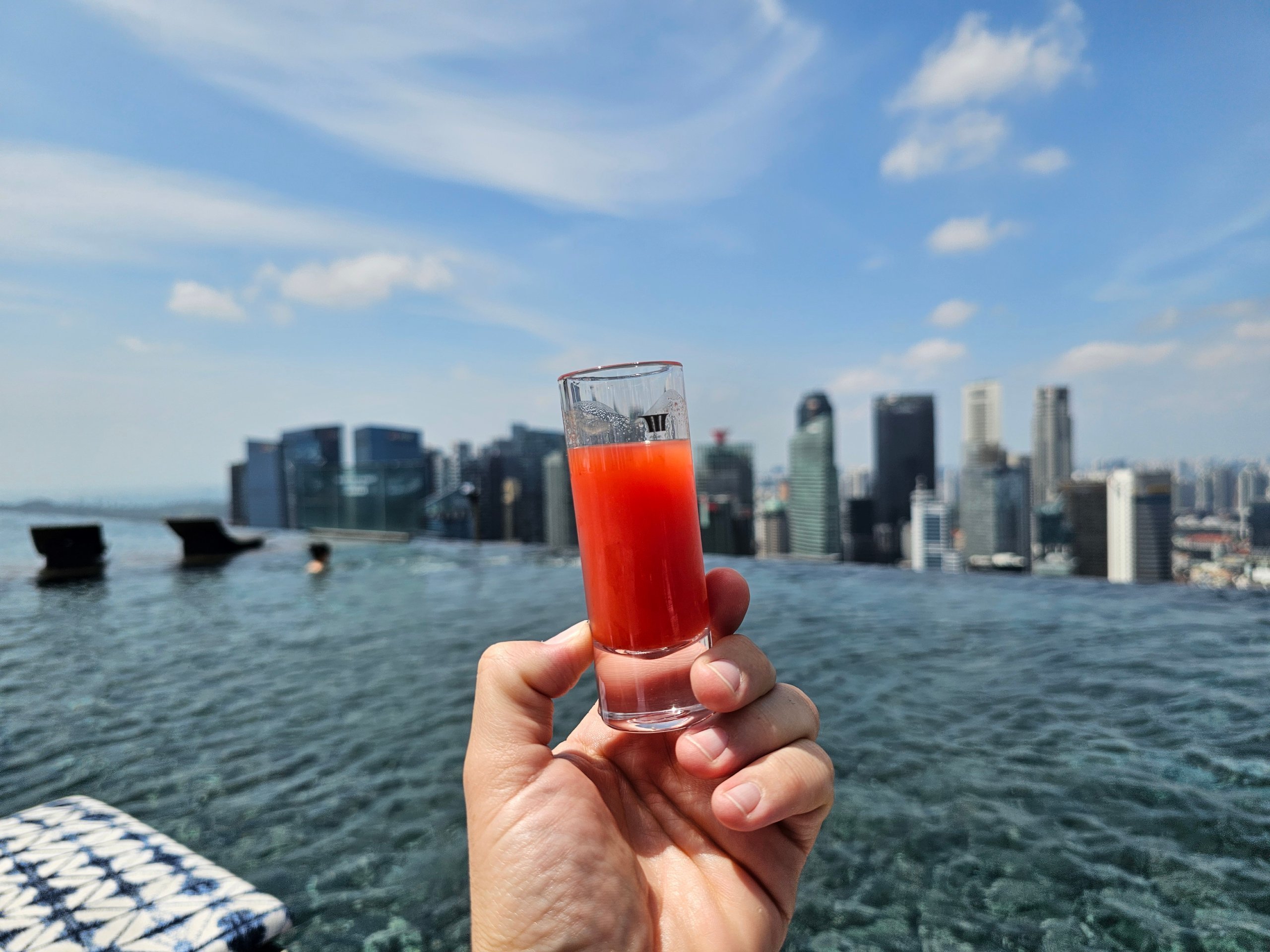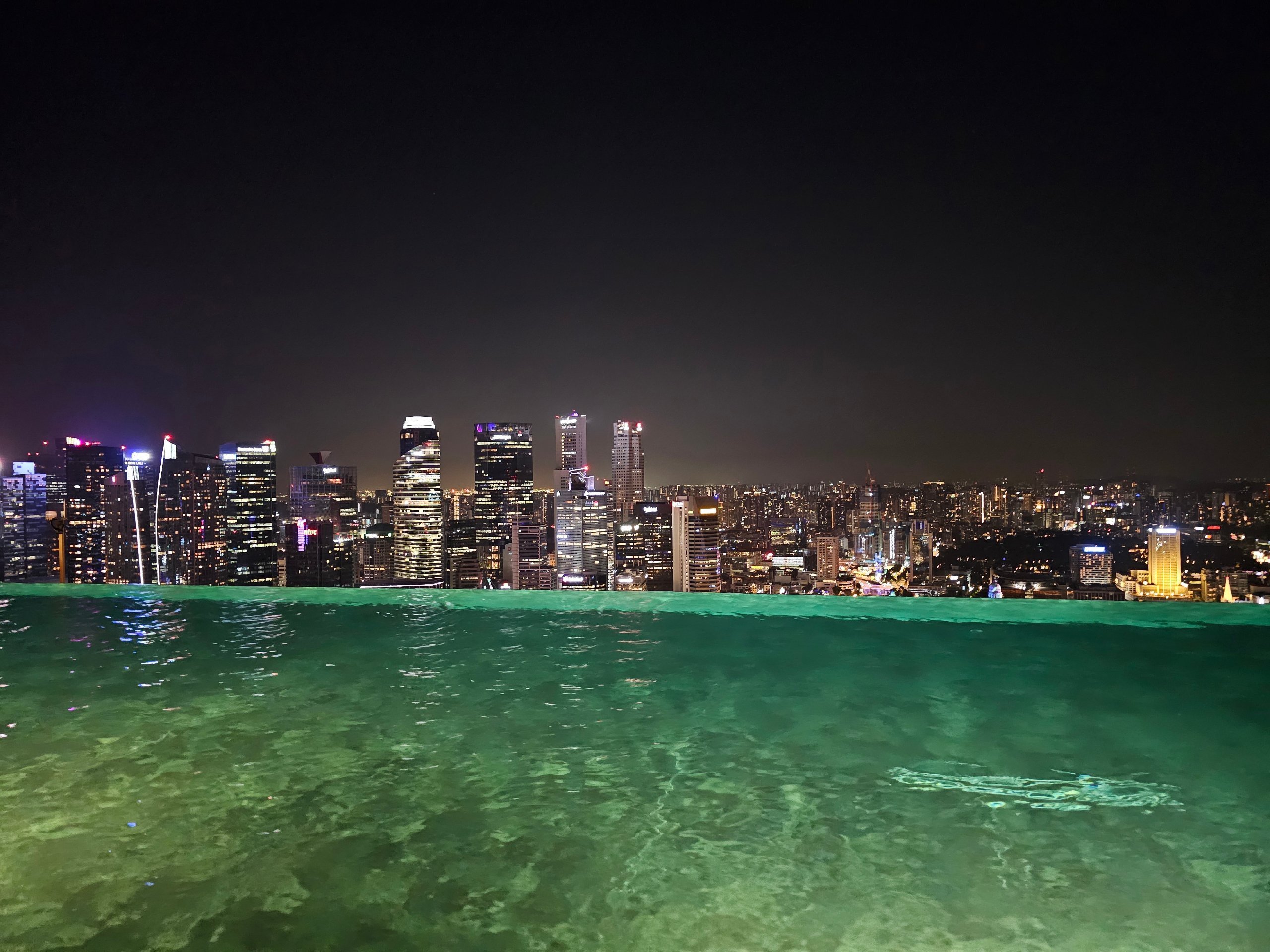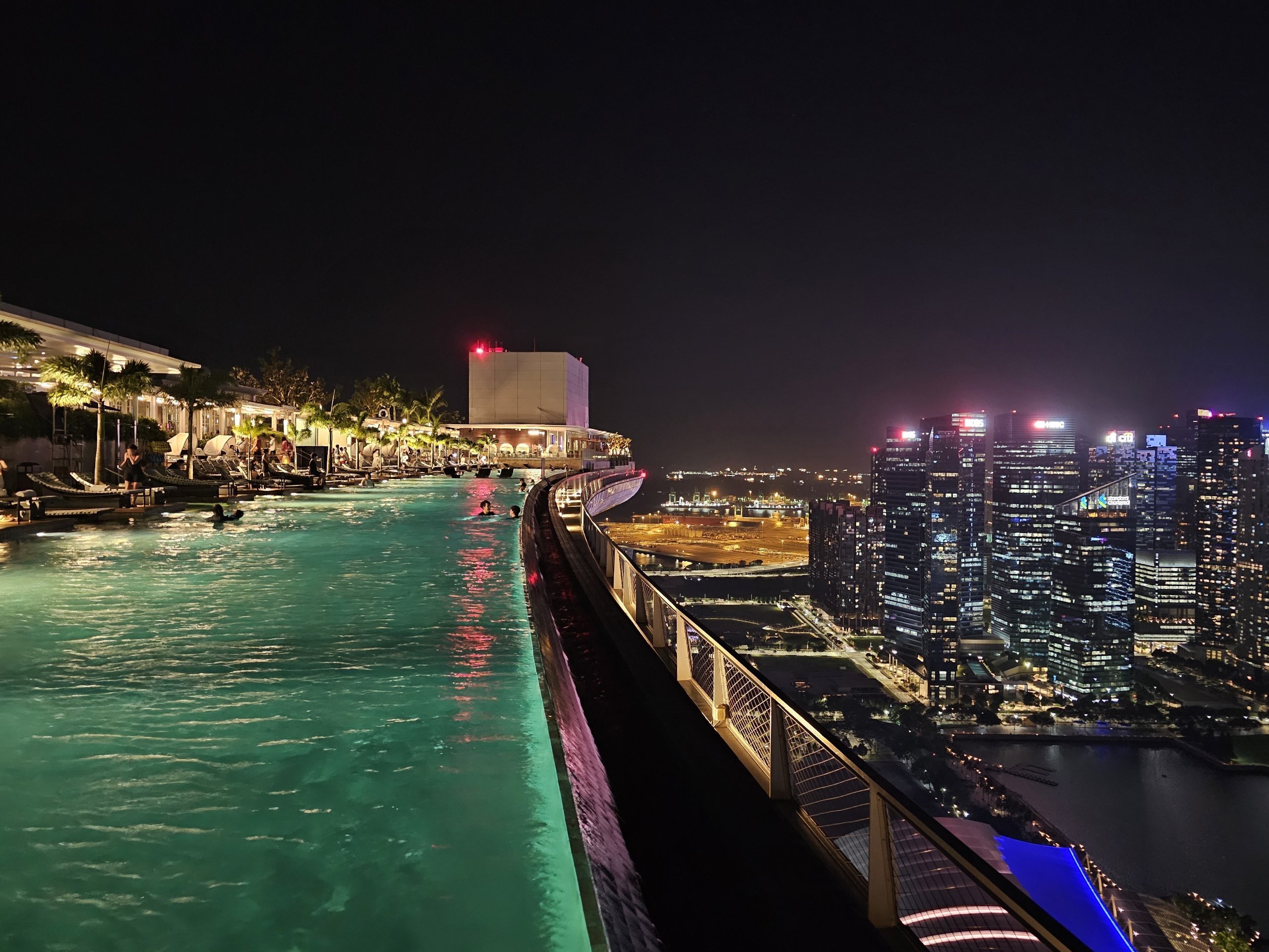 Fra poolens længde har man Singapores centrum i sin hule hånd. Og hvis man går om på den anden side af taget, kan man se Gardens by the Bay og hundredvis af fragtskibe i baggrunden på åbent hav.