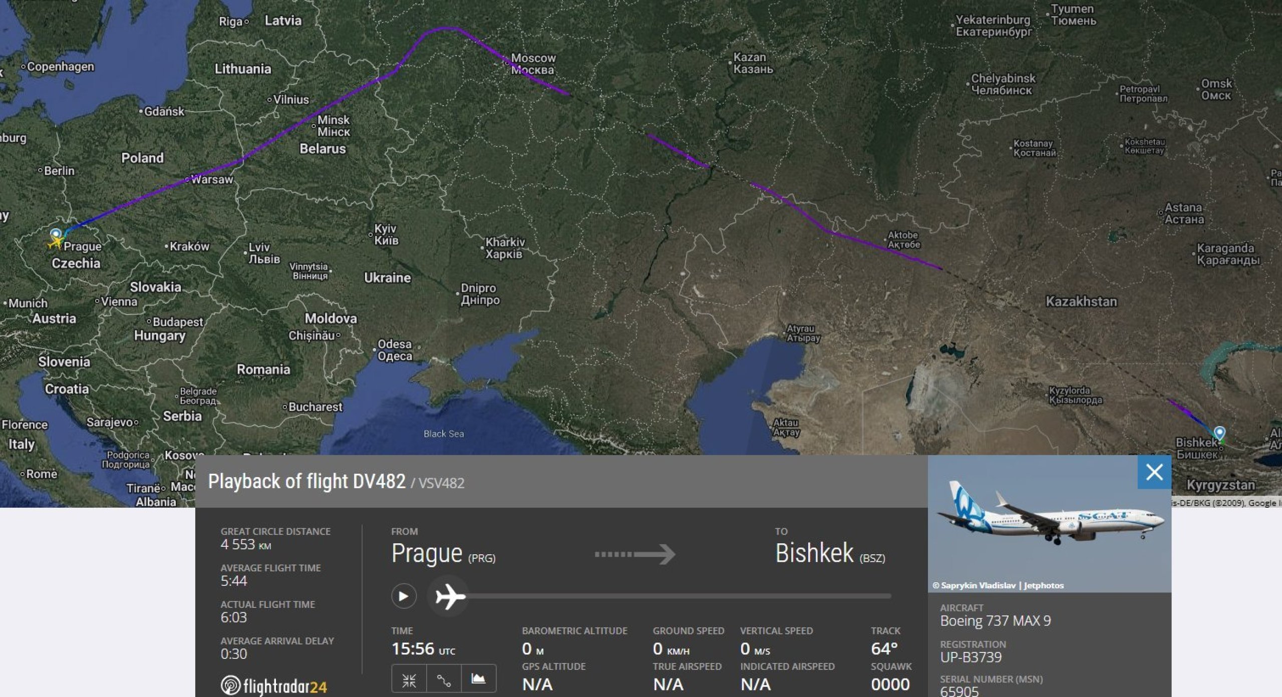 Da vi flyver med en Boeing 737 med smal krop, er det ikke realistisk at flyve denne distance på én optankning. Derfor laver vi en teknisk mellemlanding i Kirgisistan for at tanke op. Stoppet varer mindre end 1 time, og passagererne forbliver om bord på flyet hele tiden.