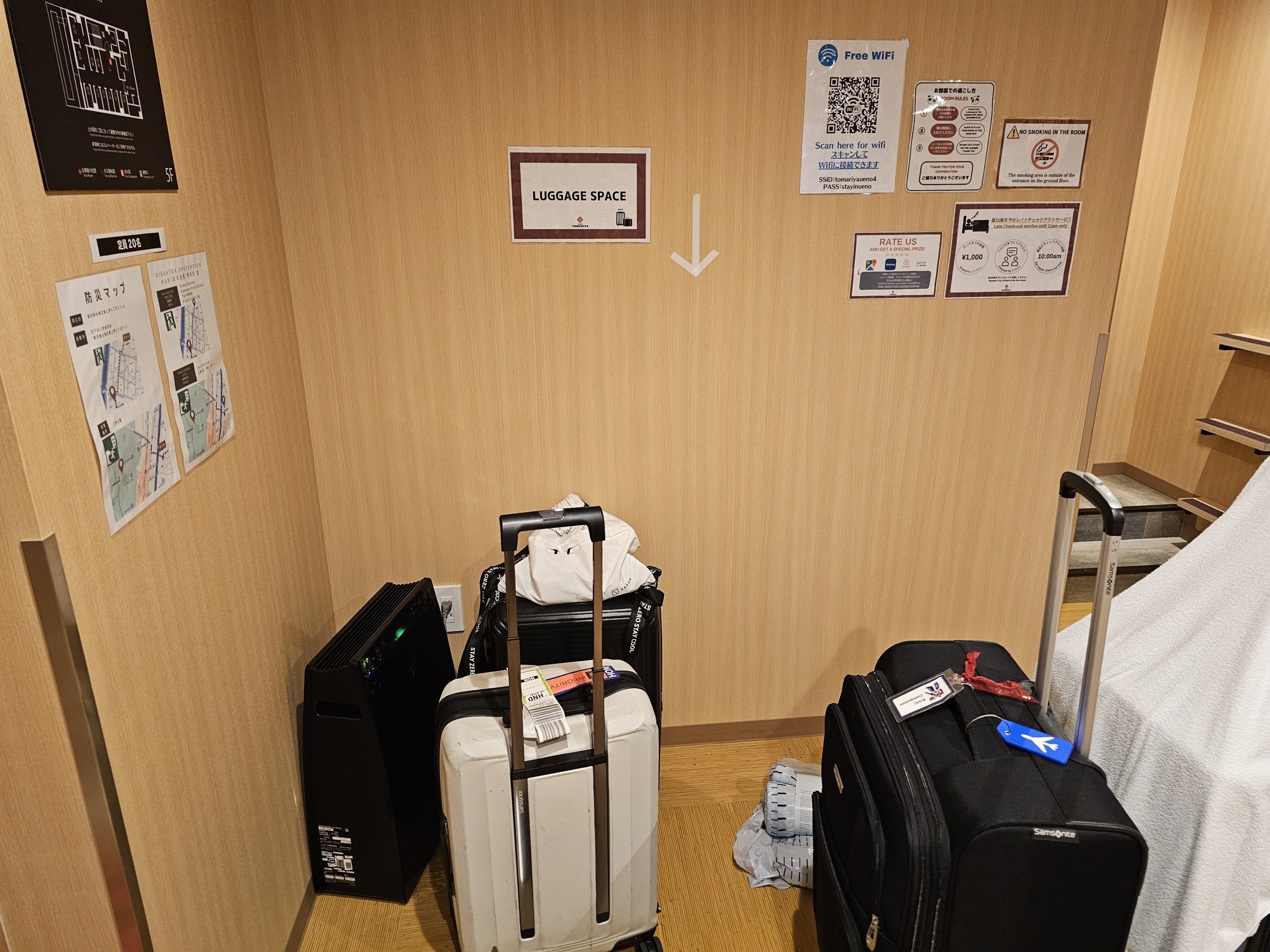 Check-in er først kl. 15. Jeg forventer ikke, at et kapselhotel giver mig ekstra service gratis, og derfor er det så meget desto mere overraskende, at jeg kan få opbevaret min bagage gratis.