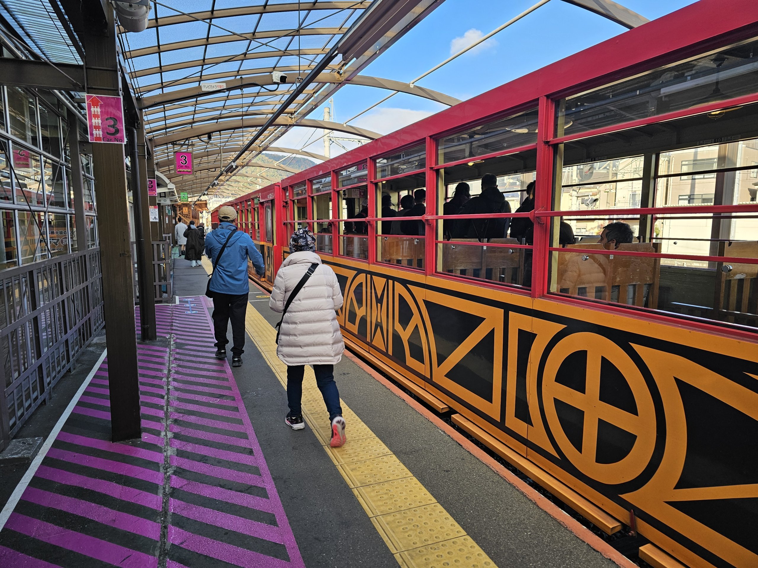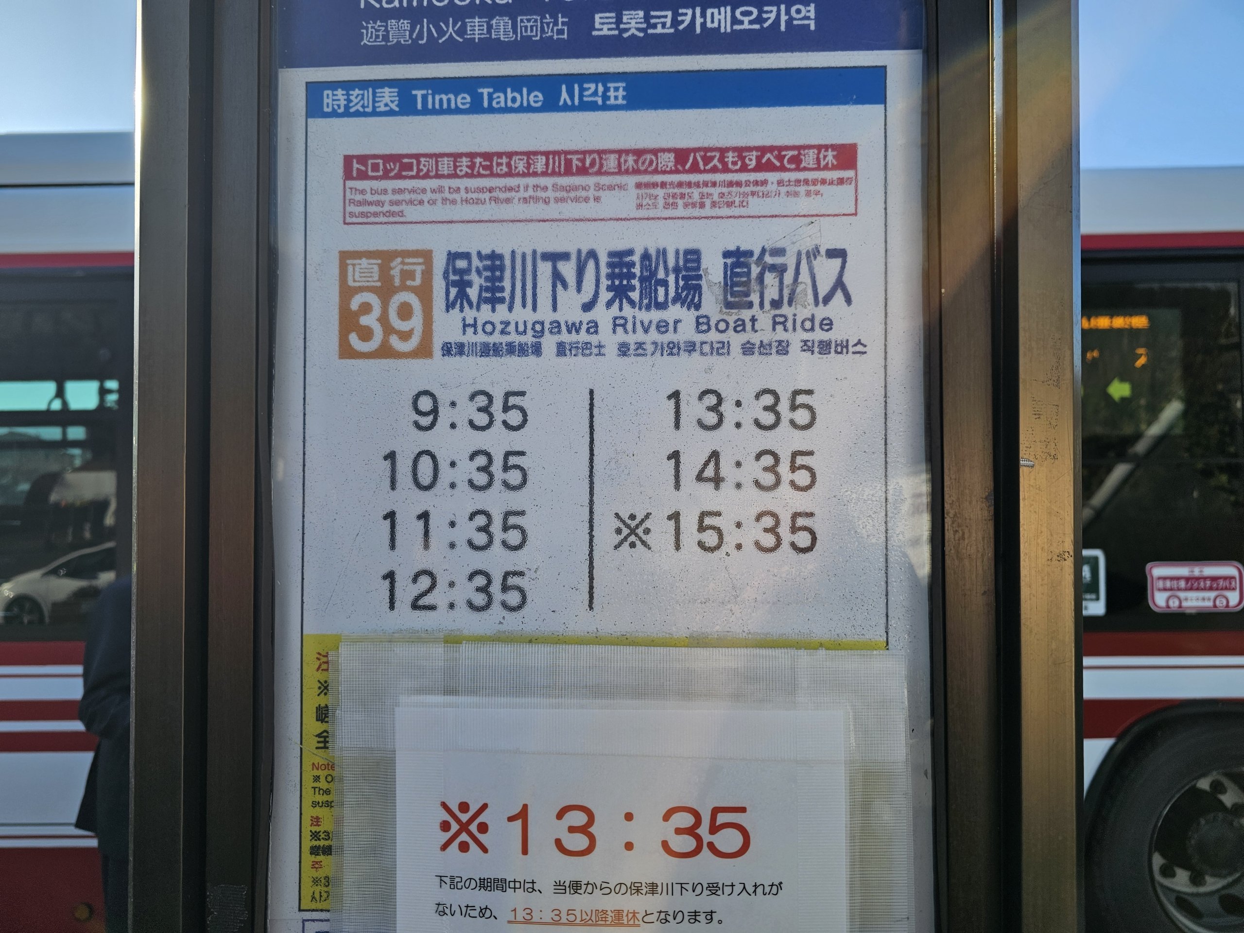 Fra det romantiske Sagano-tog kører buslinje 39 direkte til havnen med forbindelse til hvert tog, og rejsetiden er ca. 10 minutter. Du kan betale busbilletten med kontanter eller et transportkort (ICOCA, Suica eller et andet).