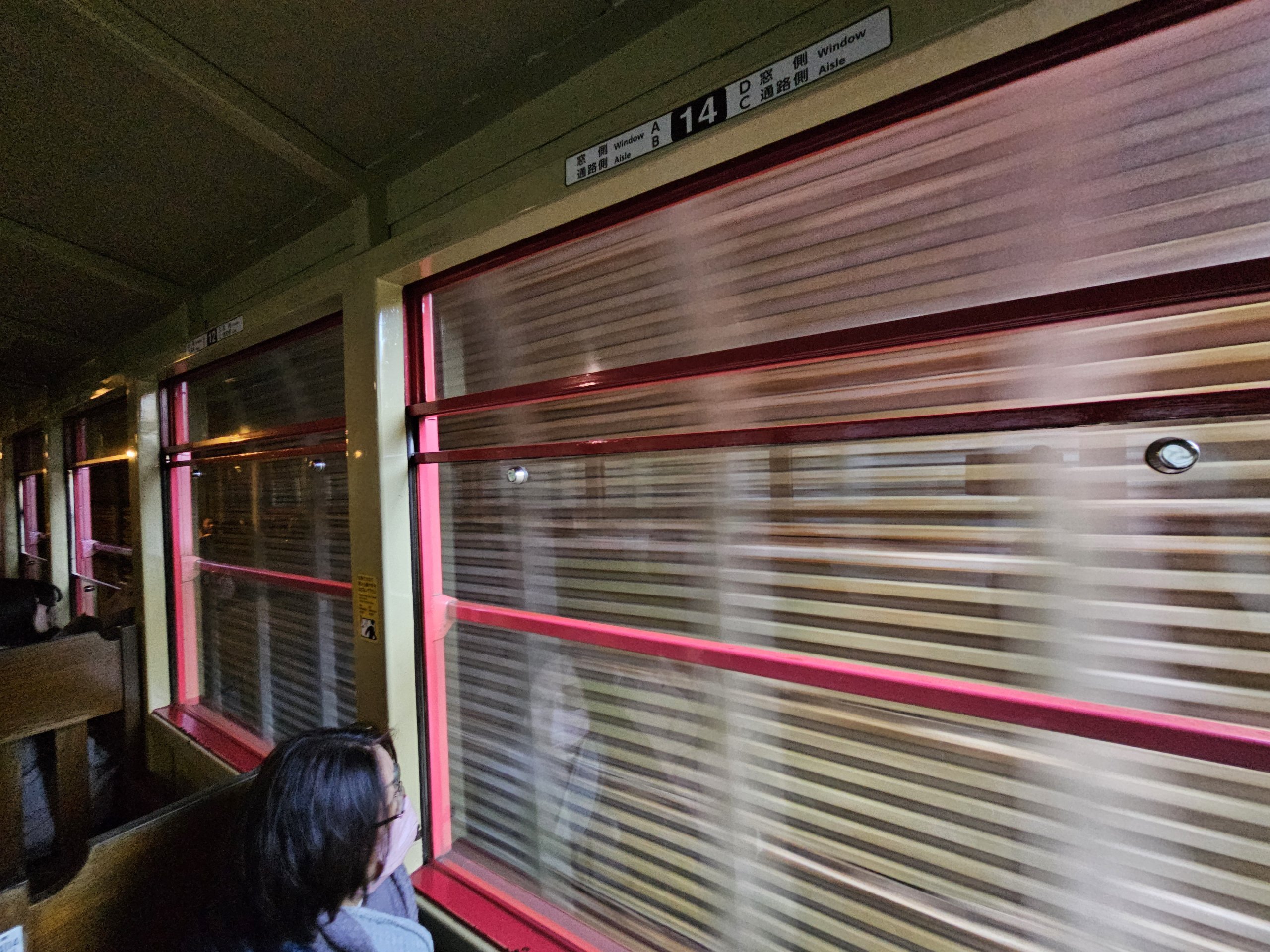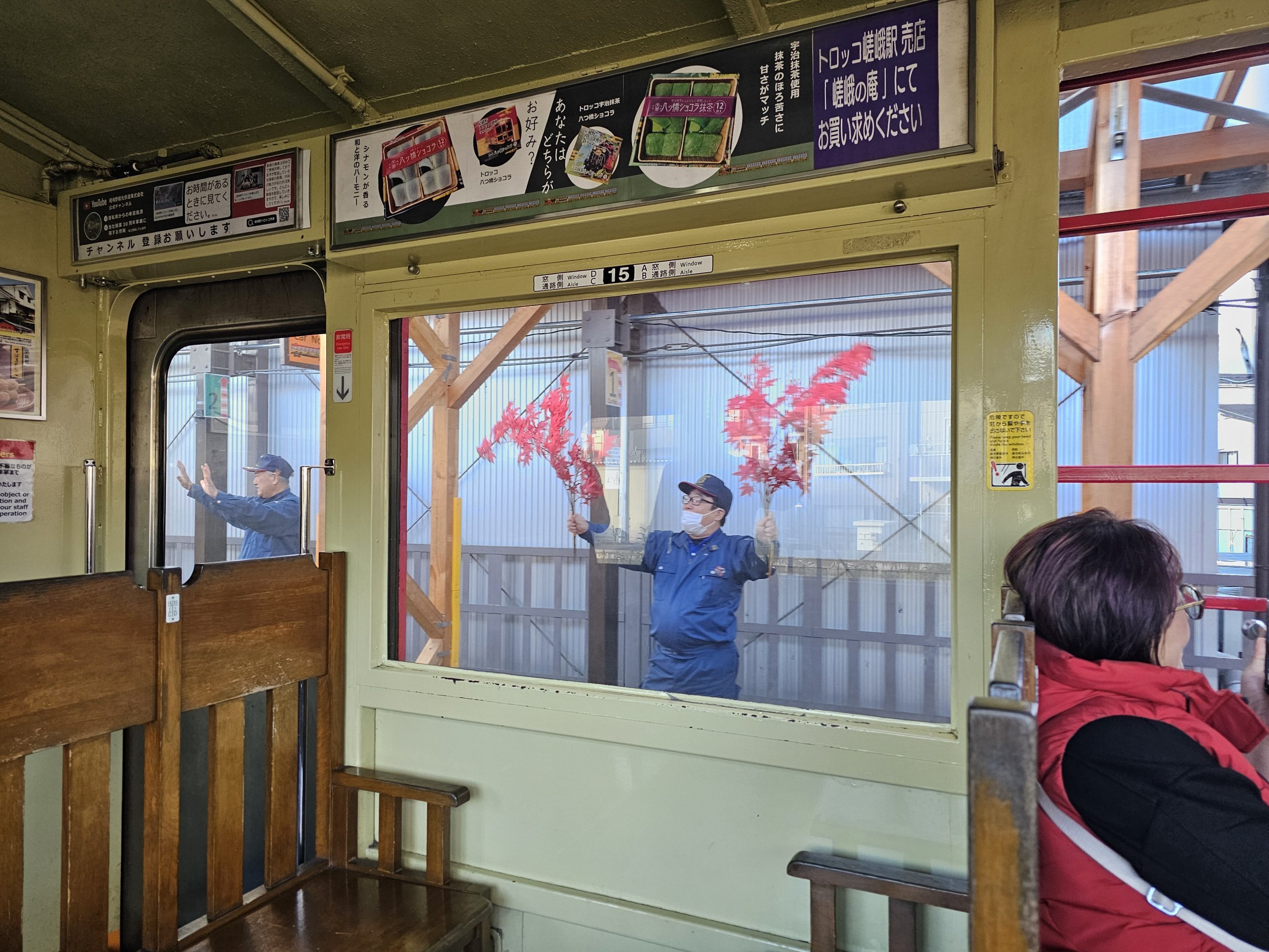 Påstigningen er velorganiseret, og da vi forlader toget, vifter personalet med grene med farverige blade. Det er lidt barnligt, men da der er mange børn i toget, er det også meget hyggeligt.