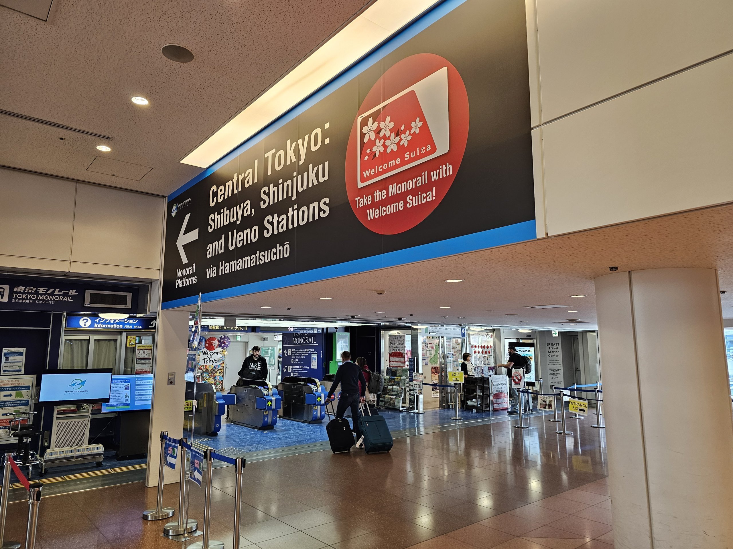 - ved automaterne uden for monorail-perronen (ikke ved automaterne i Keikyu-togene, men Suica kan bruges i disse tog bagefter)