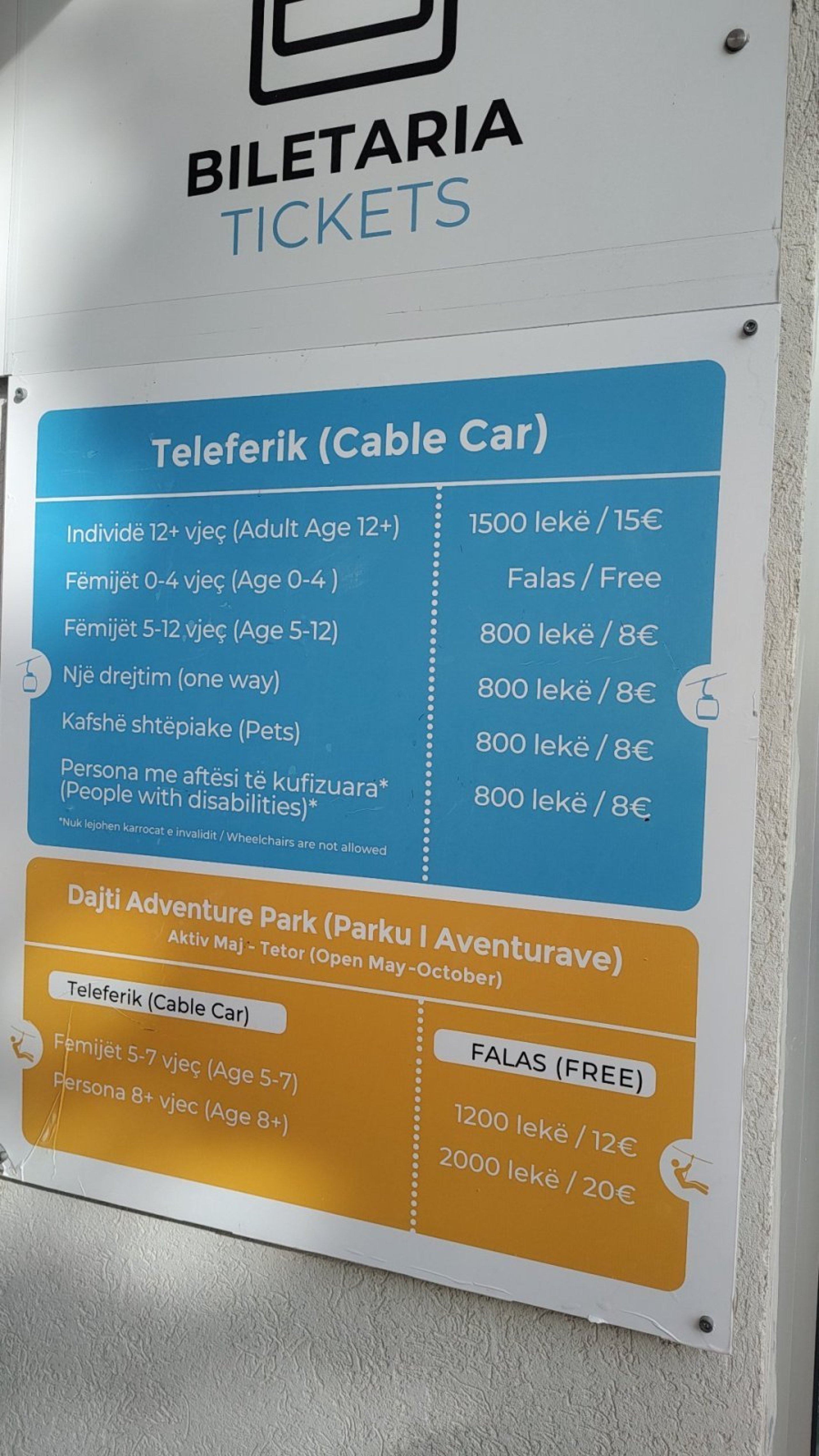 Bare for at præcisere fra november 2025 - prisen for en returbillet er 1500 Lek, altså ca. 385 CZK. Svævebanen siger, at turen tager 15 minutter, men i virkeligheden tager den ca. 19 minutter - det er en rigtig lang tur, og hvis vejret er godt, er udsigten også flot. Det er bedst at tage af sted om morgenen, så er der ikke så mange mennesker. Den offentlige bus stopper som angivet nedenfor indgangen til Bunk'Art 1 (hvis du går til bunkeren først, som vi gjorde, så spørg billetopkræveren, og han vil stoppe lige ved indgangen). Fra bunkeren og til svævebanen går du ned ad fortovet og efter ca. 250 meter drejer du til højre op ad bakke og fortsætter derefter ca. 300 meter (det er markeret med skilte). På vej til svævebanestationen kommer du forbi en lille hjørnebutik, hvor du kan købe kølige drikkevarer osv. Prisen for 1,5 liter af noget ferskenagtigt (svarende til Fanta) var vist 140 Lek, ca. 35 CZK.