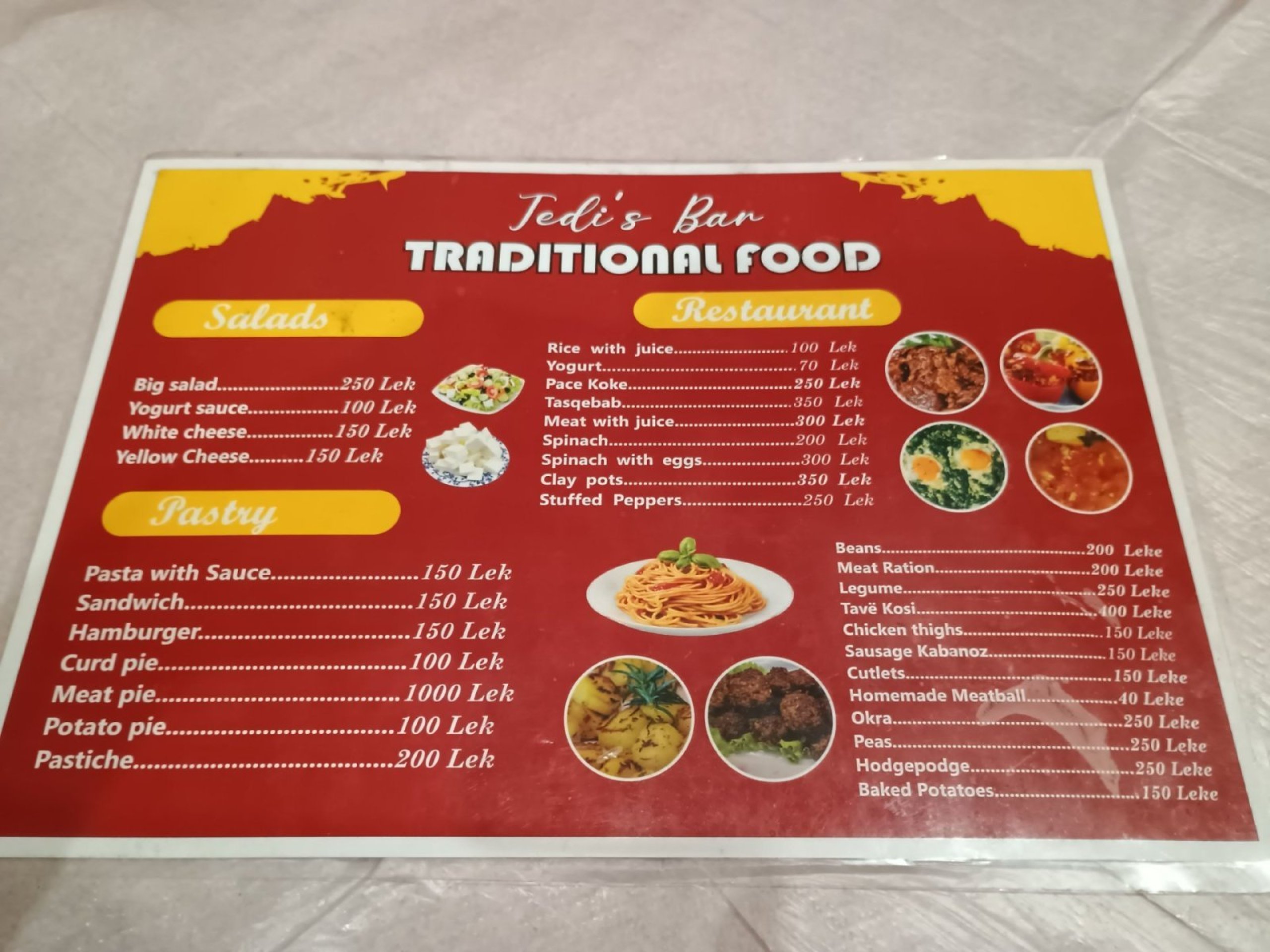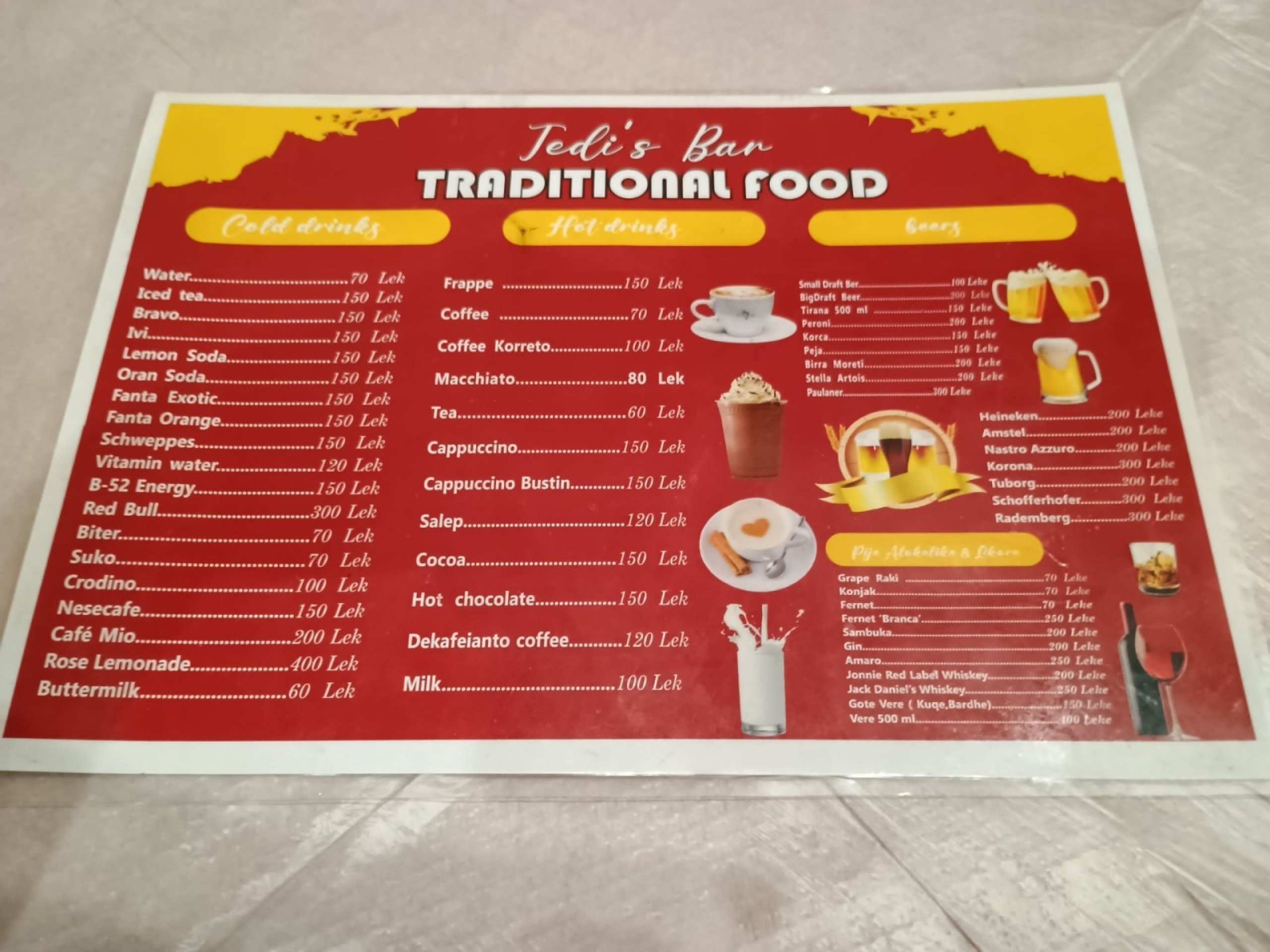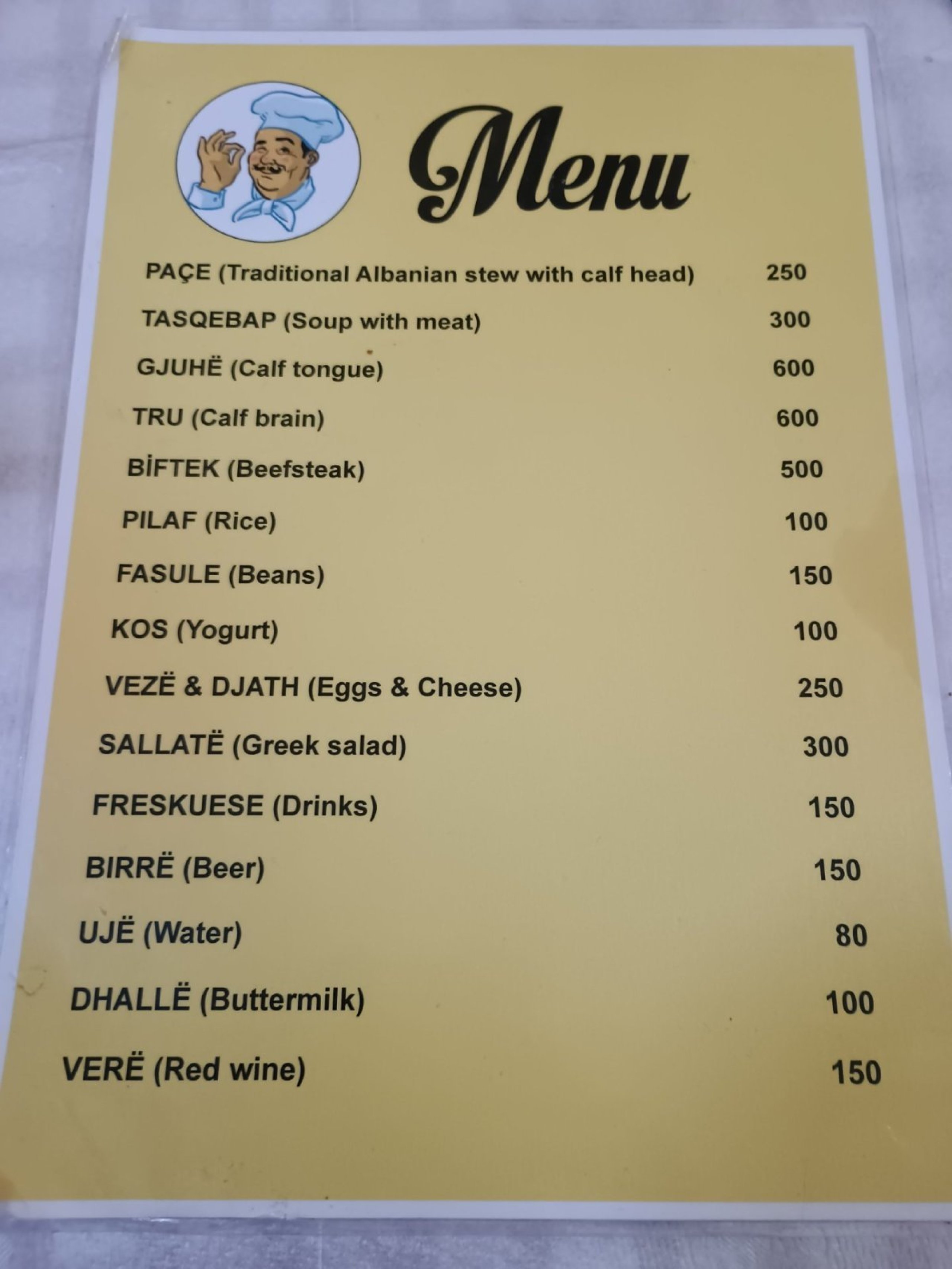 Jeg har vedhæftet menuen fra en almindelig albansk ikke-turistrestaurant i nærheden af busstationen i Drača og markedet i Tirana - der er stor forskel på priserne på restauranter i turistområderne.