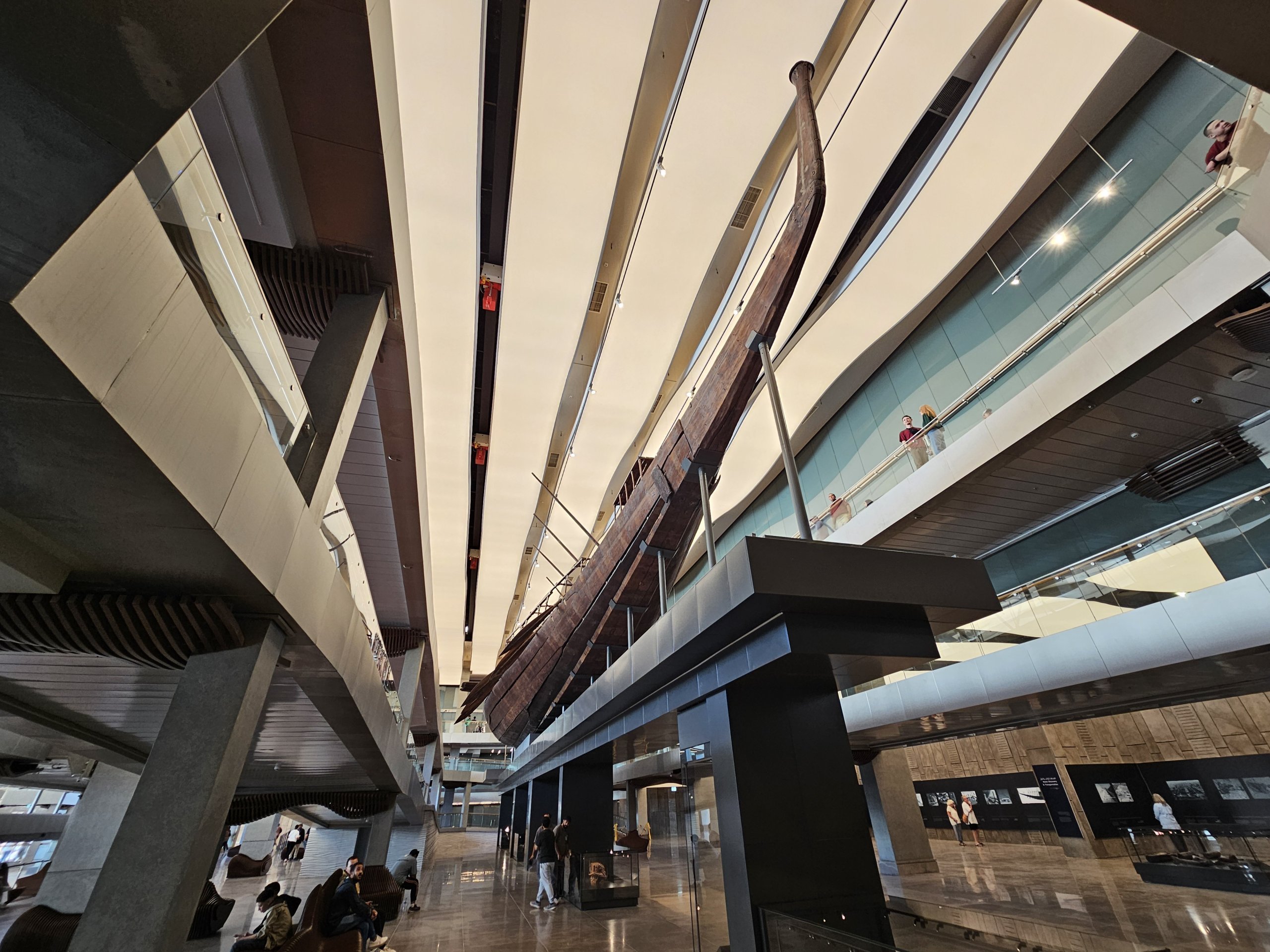 Fra den store hal anbefaler jeg at gå direkte til den mindre bygning overfor, hvor der er udstillet to nøjagtige kopier af kong Khufus træskibe.