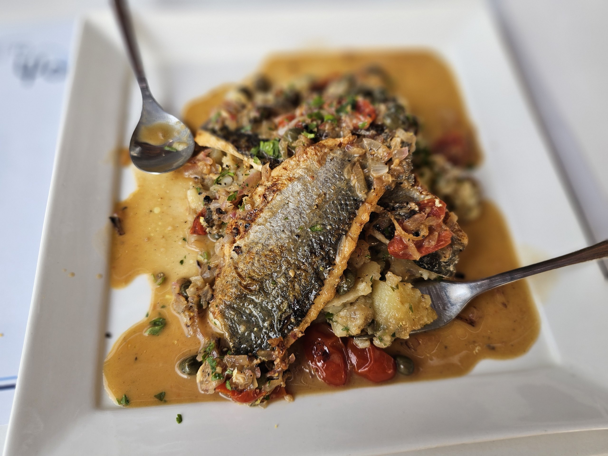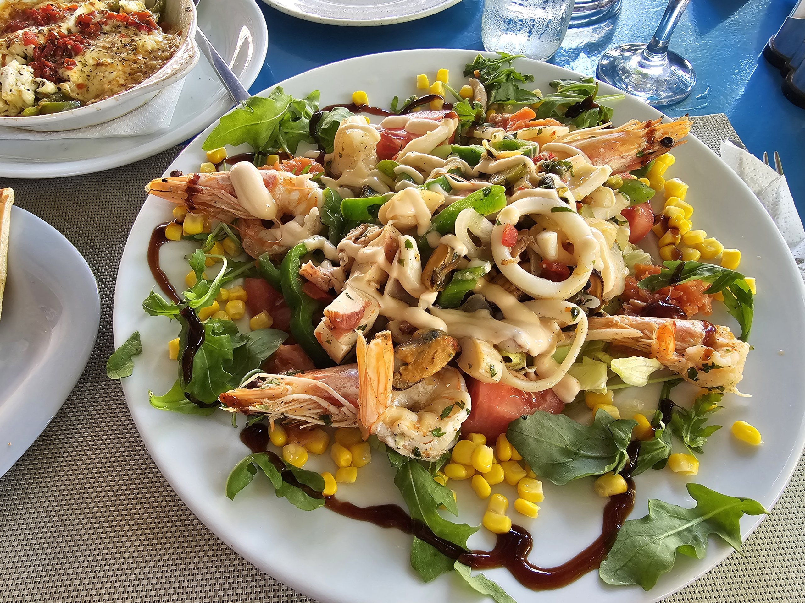 Fisk ogskaldyr - ud over fisk tilbyder alle restauranter naturligvis også retter (for det meste salater) med andre fisk og skaldyr som muslinger, rejer og blæksprutter.