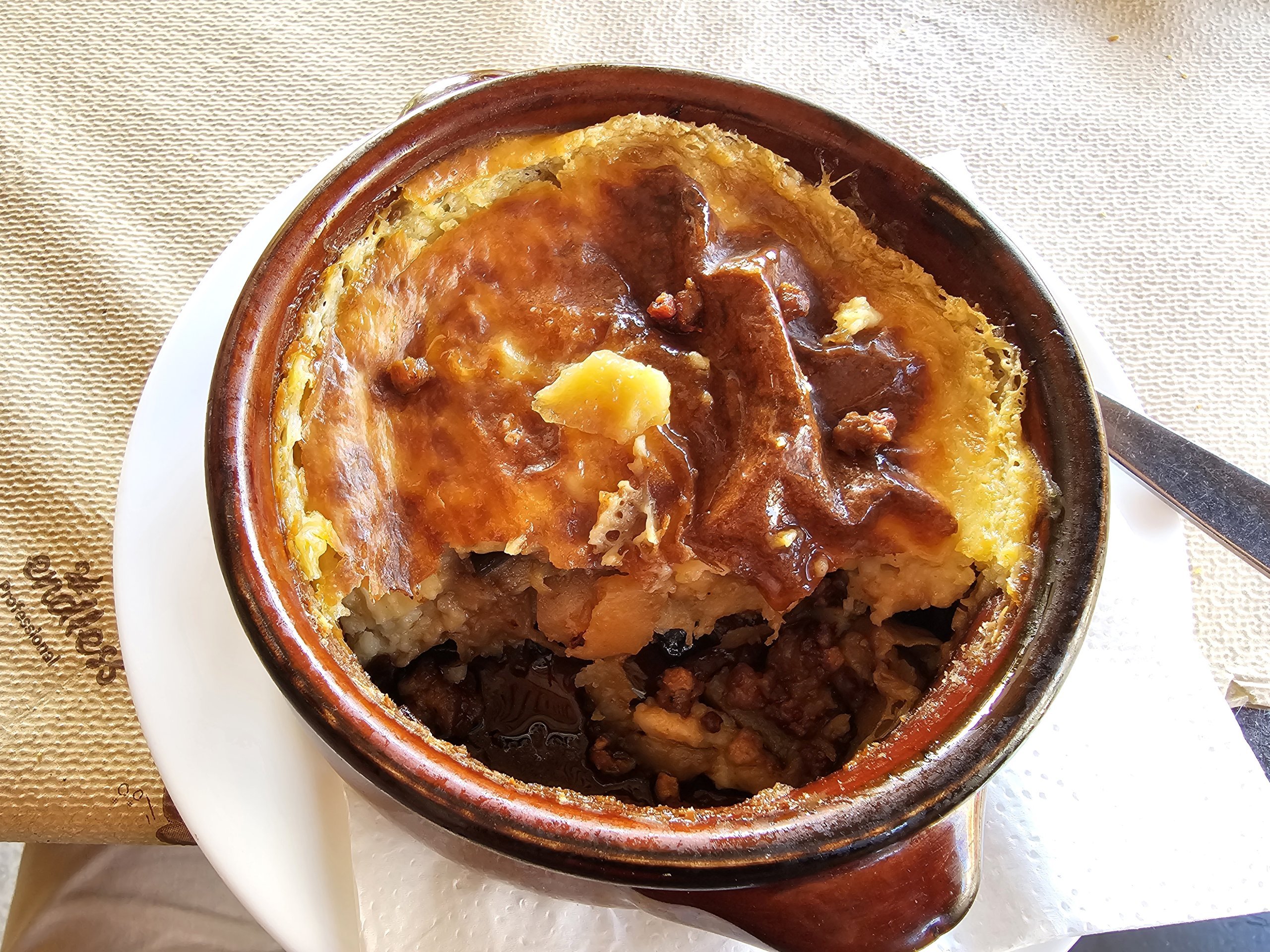 Musaka - en af de mest berømte græske retter, ofte kaldet "balkanlasagne". Det er flere lag bagt aubergine (sjældent en skål med zucchini-aubergine) blandet med lam og toppet med en bechamelsauce.