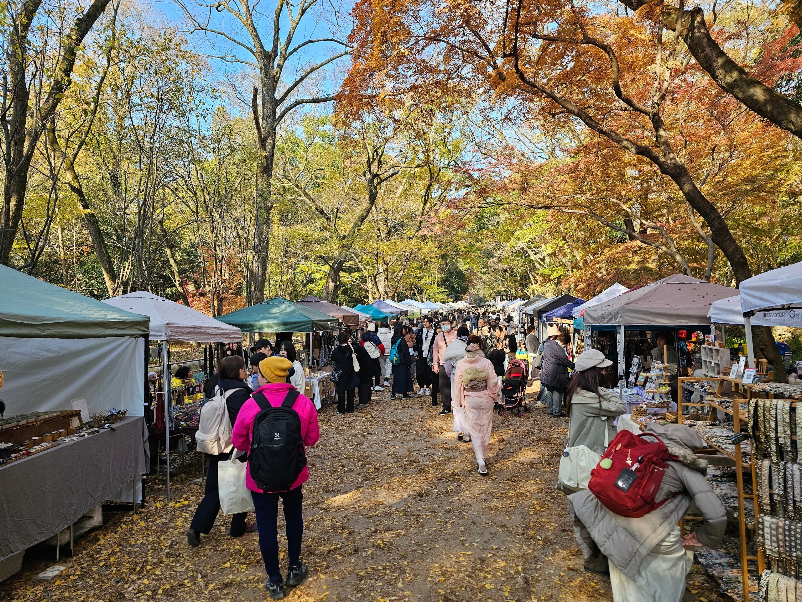 En vandresti fuld af souvenirboder løber gennem Tadasu no Mori-skoven.