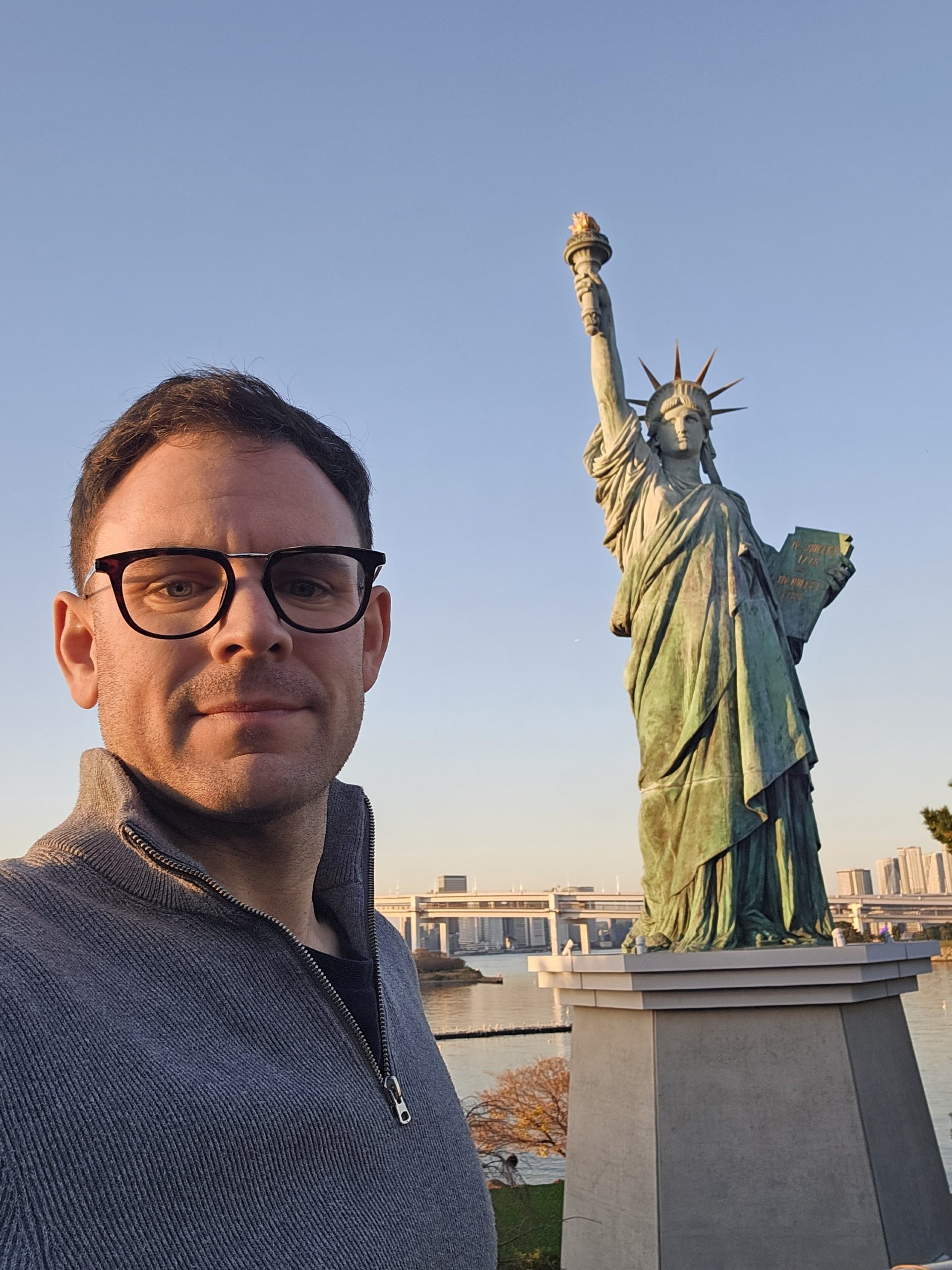 Odaiba Statue of Liberty står på en populær fodgængerpromenade fyldt med madboder og udsigt over Tokyo Bay og Rainbow Bridge.