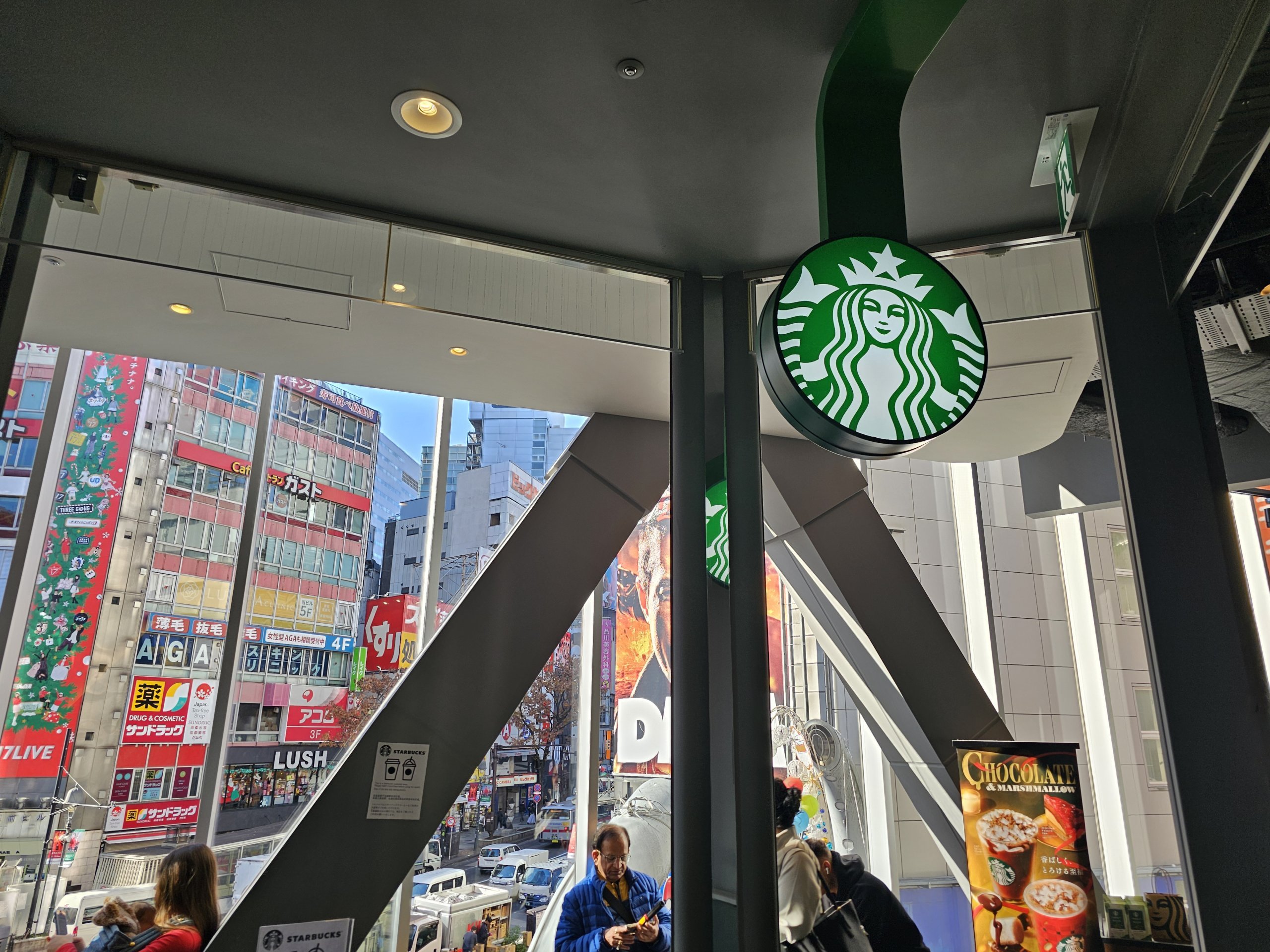 Den har en fin udsigt over Shibuya-krydset, men ikke så perfekt som Share Lounge, da den er lidt blokeret af tagkonstruktionen.