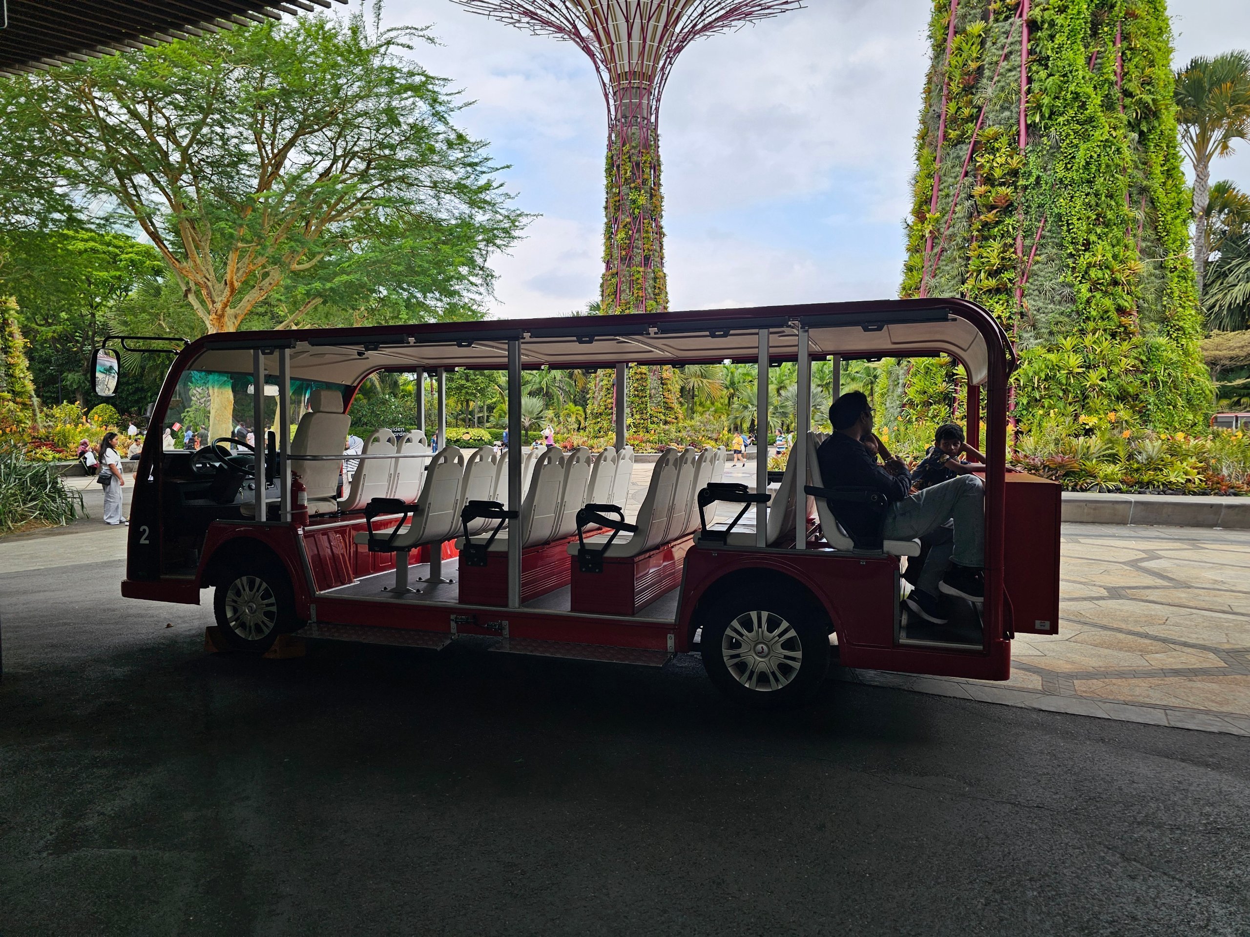 Fra hovedindgangen, som ligger mod syd (på den modsatte side af Marina Bay Sands-hotellet), kan man også betale for en tur med en elektrisk trolley for 10 sgd. Der er også skabe ved indgangen til opbevaring af bagage.