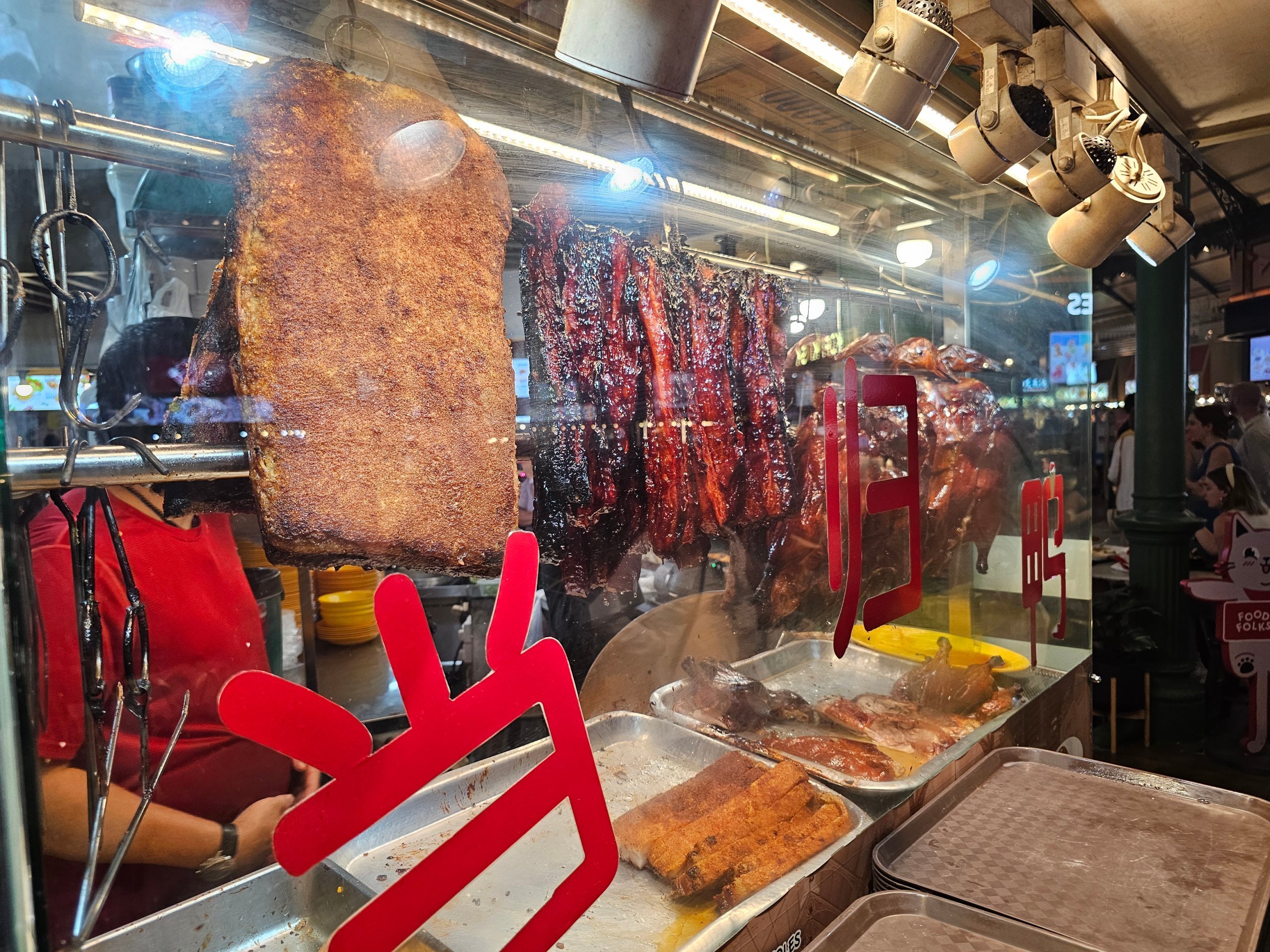 Atmosfæren er helt anderledes end inde på markedet - duften af grillet kød, røgen fra grillene og det travle natteliv skaber en af de mest ikoniske streetfood-oplevelser i Singapore.