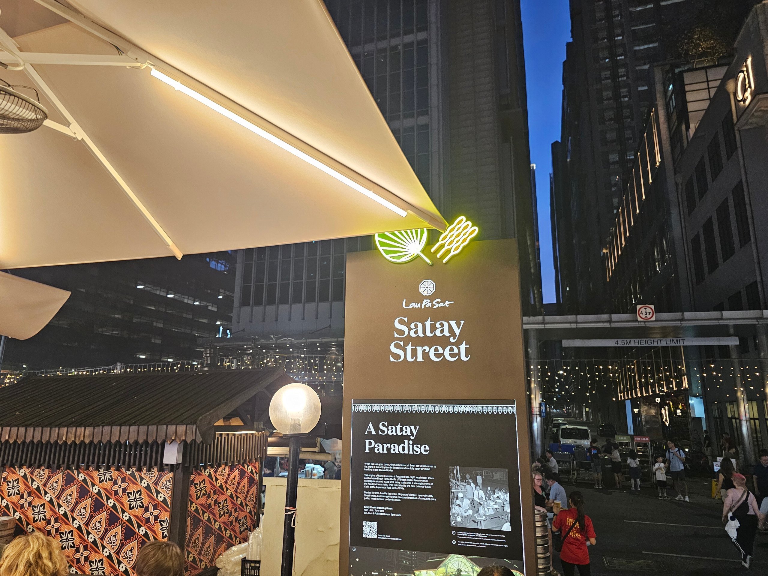 Om dagen er Lau Pa Sat mere en almindelig kantine for kontorfolk. Den rigtige atmosfære kommer om aftenen, når Satay Street åbner.