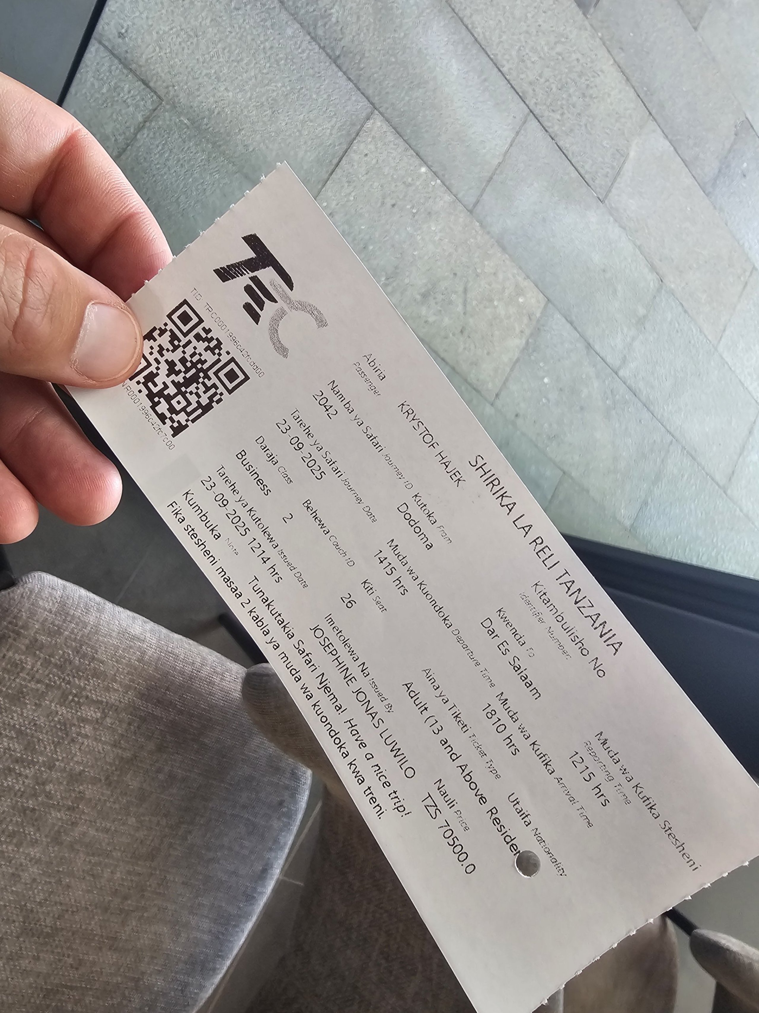 Billetter til moderne SGR-tog kan også købes gennem tredjeparter som 12go.asia, som vi gerne bruger, når vi rejser i Asien. Men det fungerede slet ikke i Tanzania. Denne hjemmeside arrangerer togbilletter gennem en lokal mellemmand, men selv efter flere opfordringer sendte han ikke billetten, og jeg var nødt til at købe en ny billet på stationen.