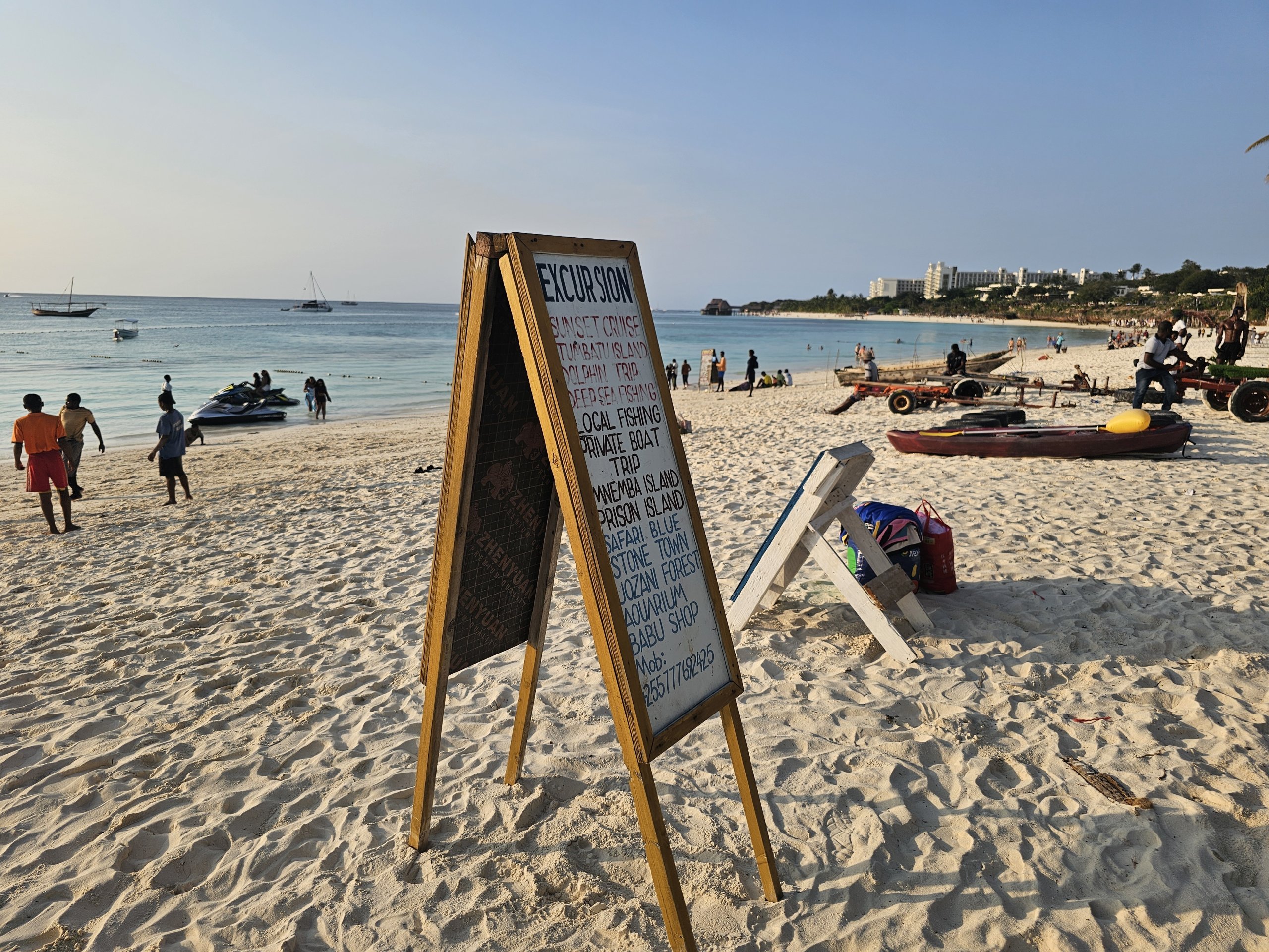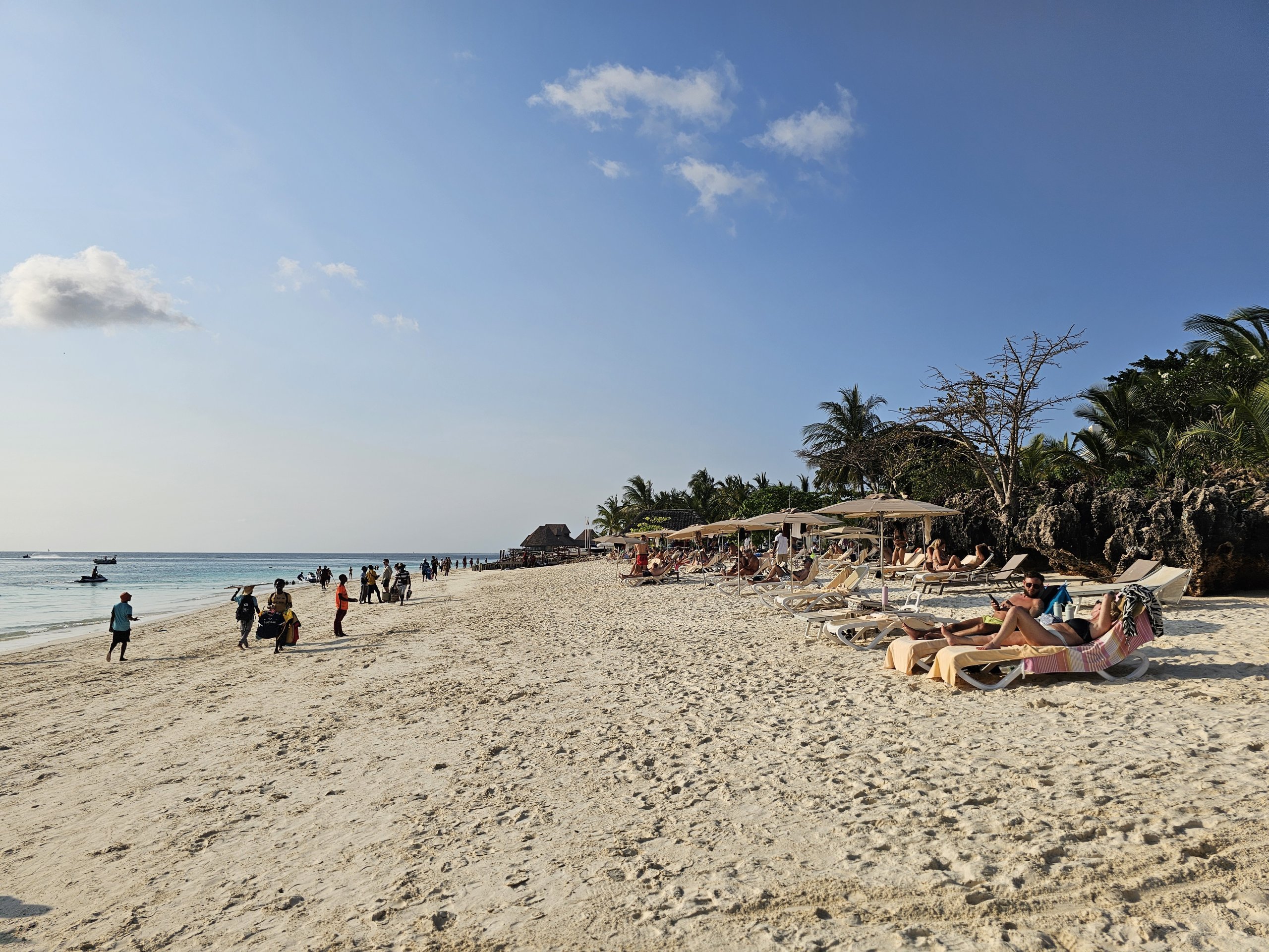 Den lokale strand er absolut den flotteste, jeg har besøgt på Zanzibar, og man kan svømme i havet selv ved lavvande, i modsætning til strandene på østkysten.