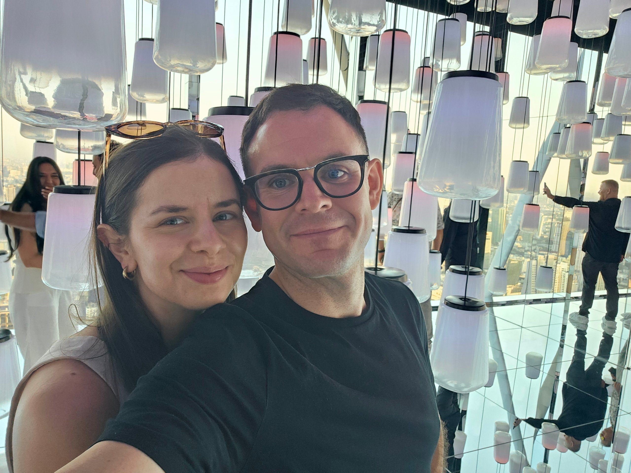 Et spejlende observatorium i to niveauer med 360° udsigt, hvor menneskerne og byen i baggrunden spejler sig smukt.