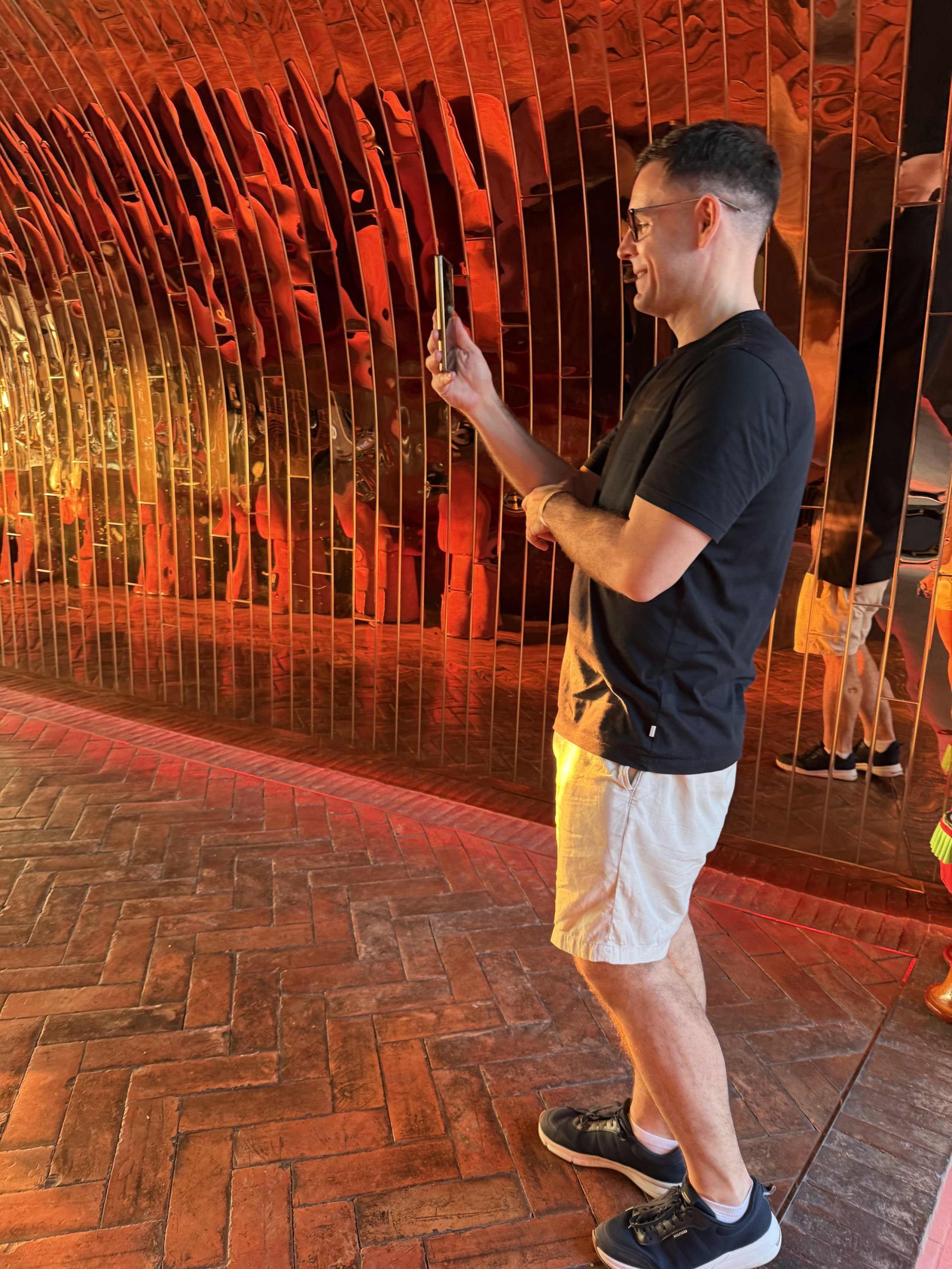 Pladsen er mere livlig, der spilles musik, og terrassen føles mere som en lounge eller et feststed. Udsigten er allerede helt natlig, og installationerne skiller sig mere ud end om dagen.