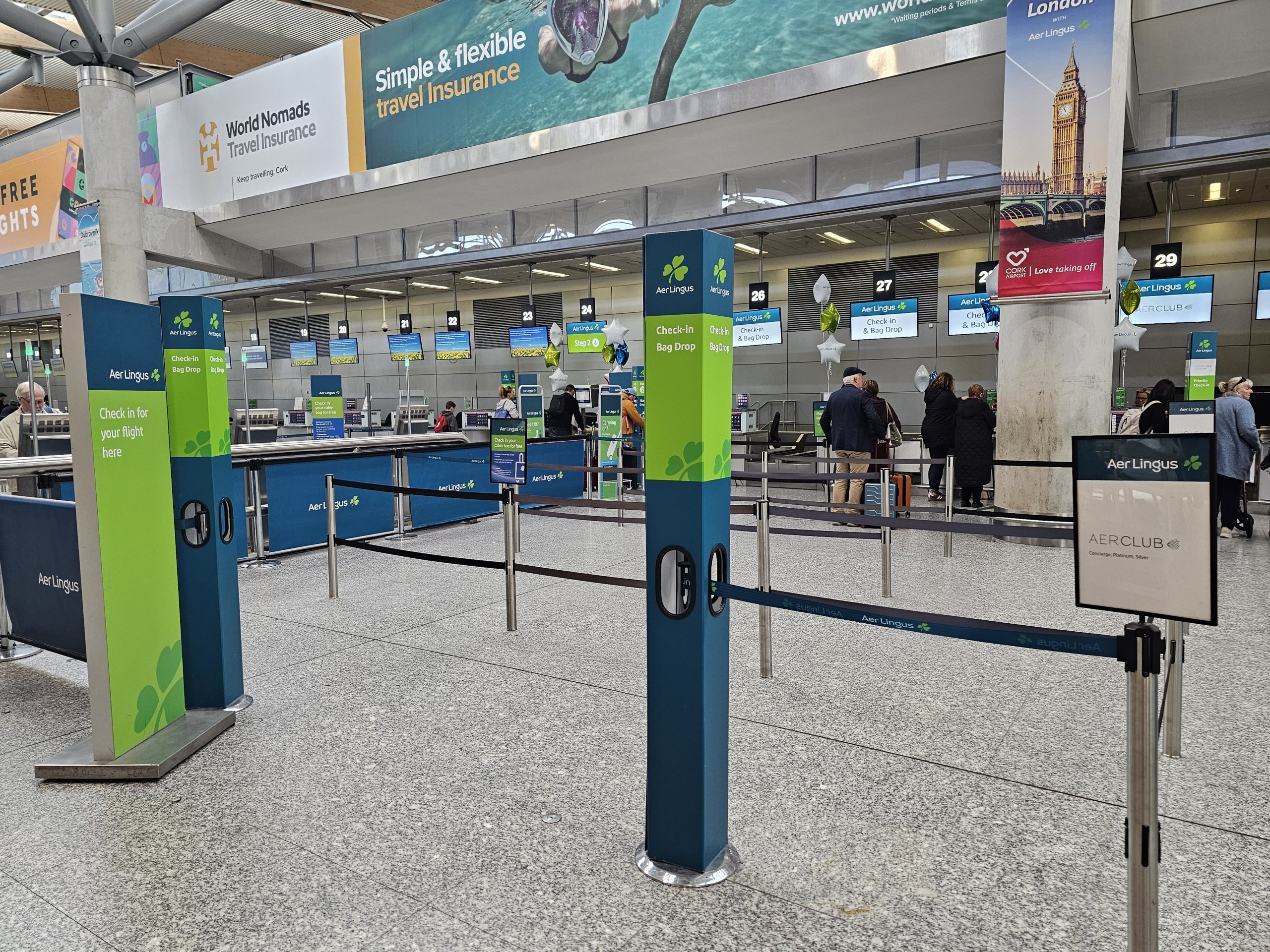 Check-in i lufthavnen er gratis for alle Aer Lingus-passagerer. Skrankerne er åbne på følgende måde afhængigt af flytype:
