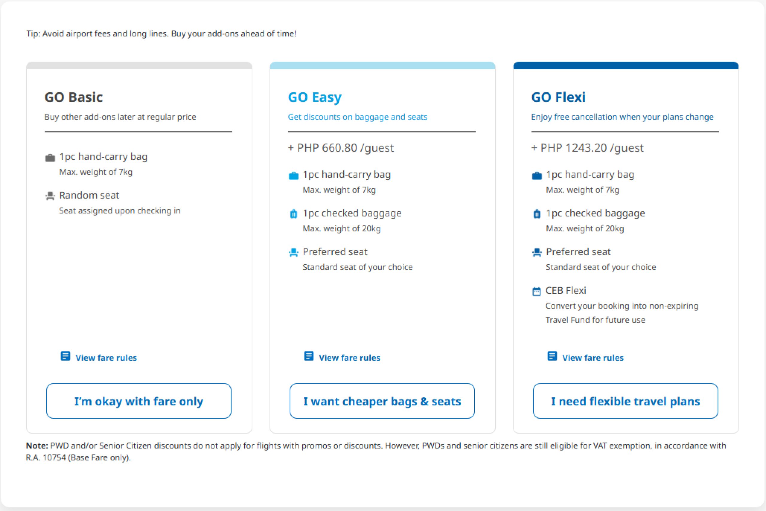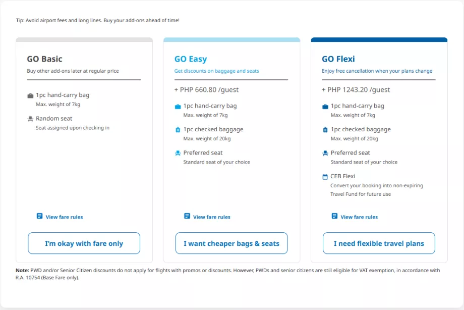 - GO Flexi - Gratis indchecket bagage (20 kg) og håndbagage, gratis sædevalg, gratis afbestilling (pengene refunderes som en kredit til fremtidig brug med Cebu Pacific)