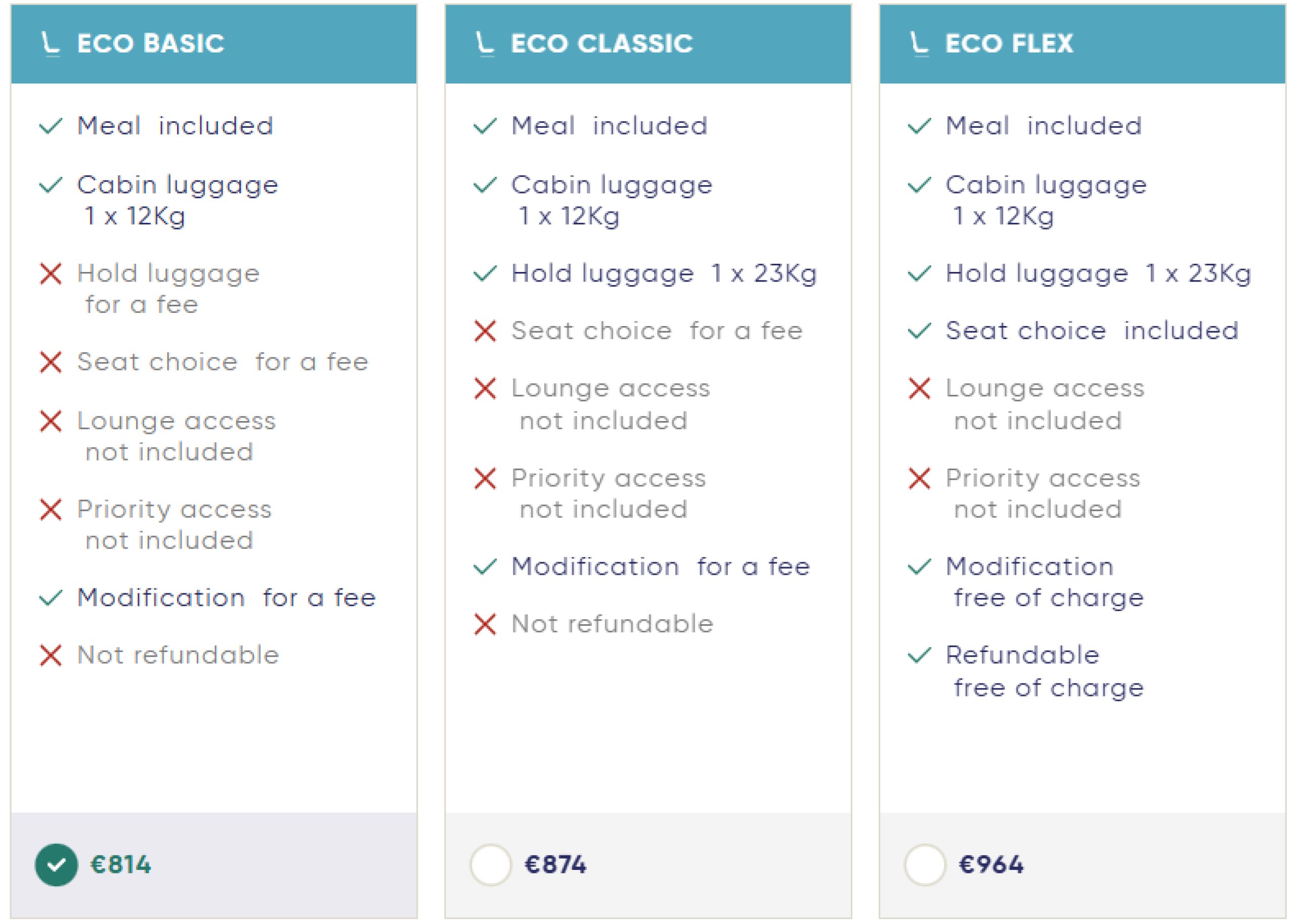 De forskellige pakker adskiller sig f.eks. med hensyn til antallet af indcheckede tasker og mulighederne for at ændre eller refundere.