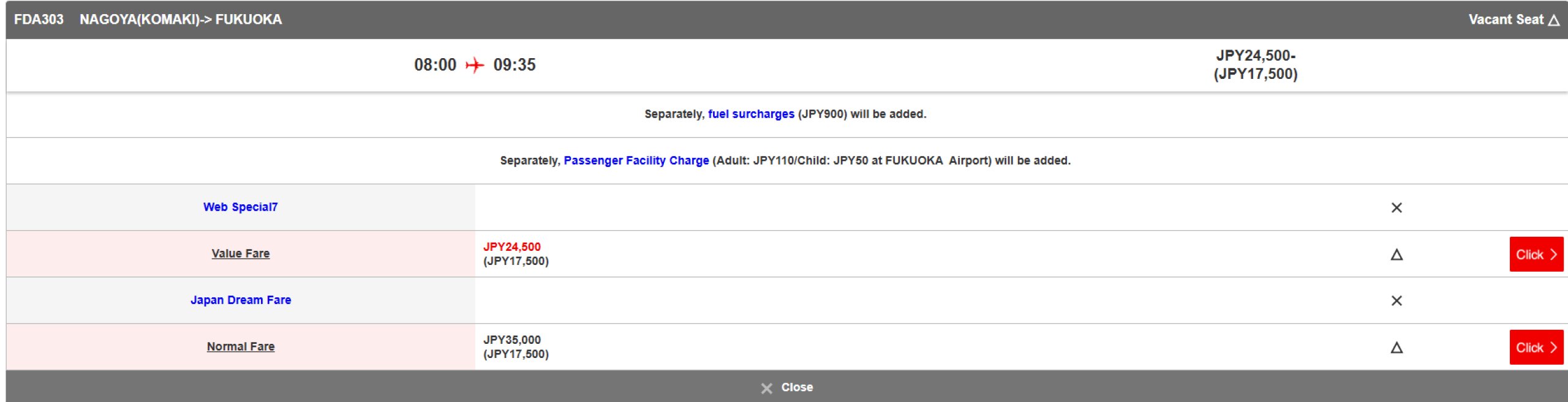 Flybilletter sælges normalt på den officielle fujidream.co.jp-hjemmeside, men betaling med udenlandske kort fungerer ikke altid.