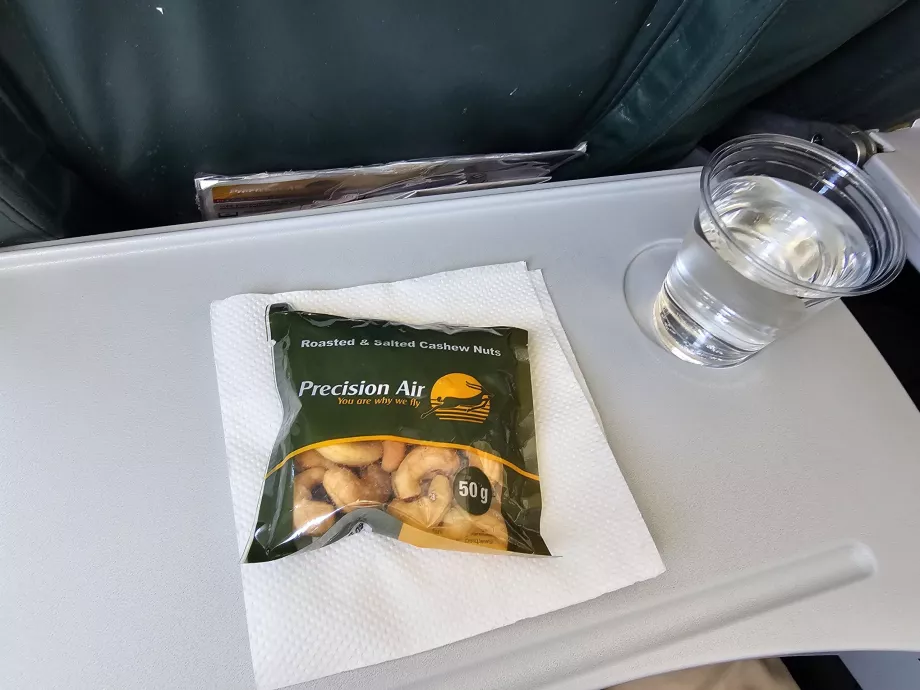 På korte indenrigsflyvninger får du gratis vand og en sød muffin eller cashewnødder.