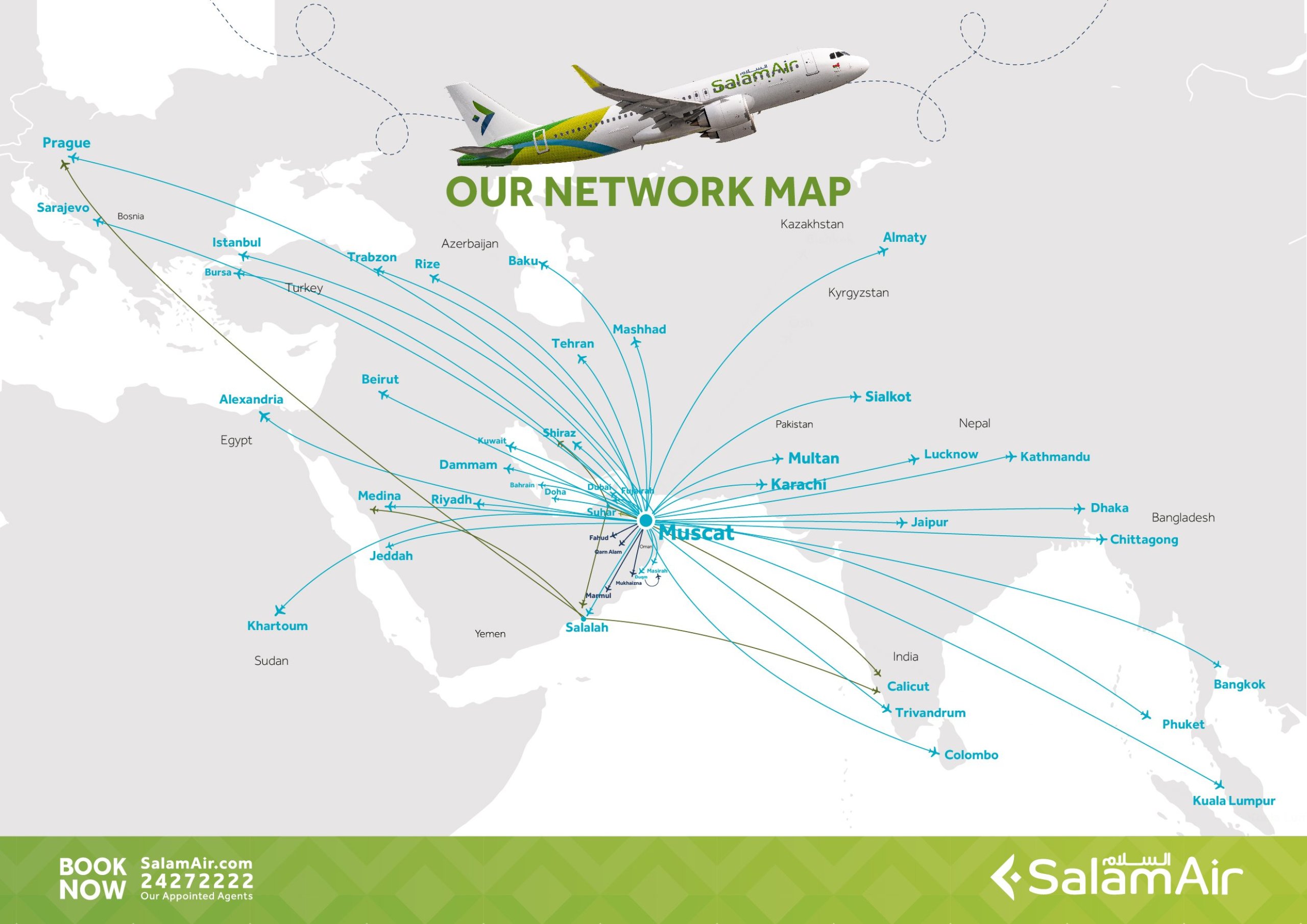 For en klar liste over destinationer, se venligst SalamAirs flykort på salamair.com/our-network eller billedet nedenfor.