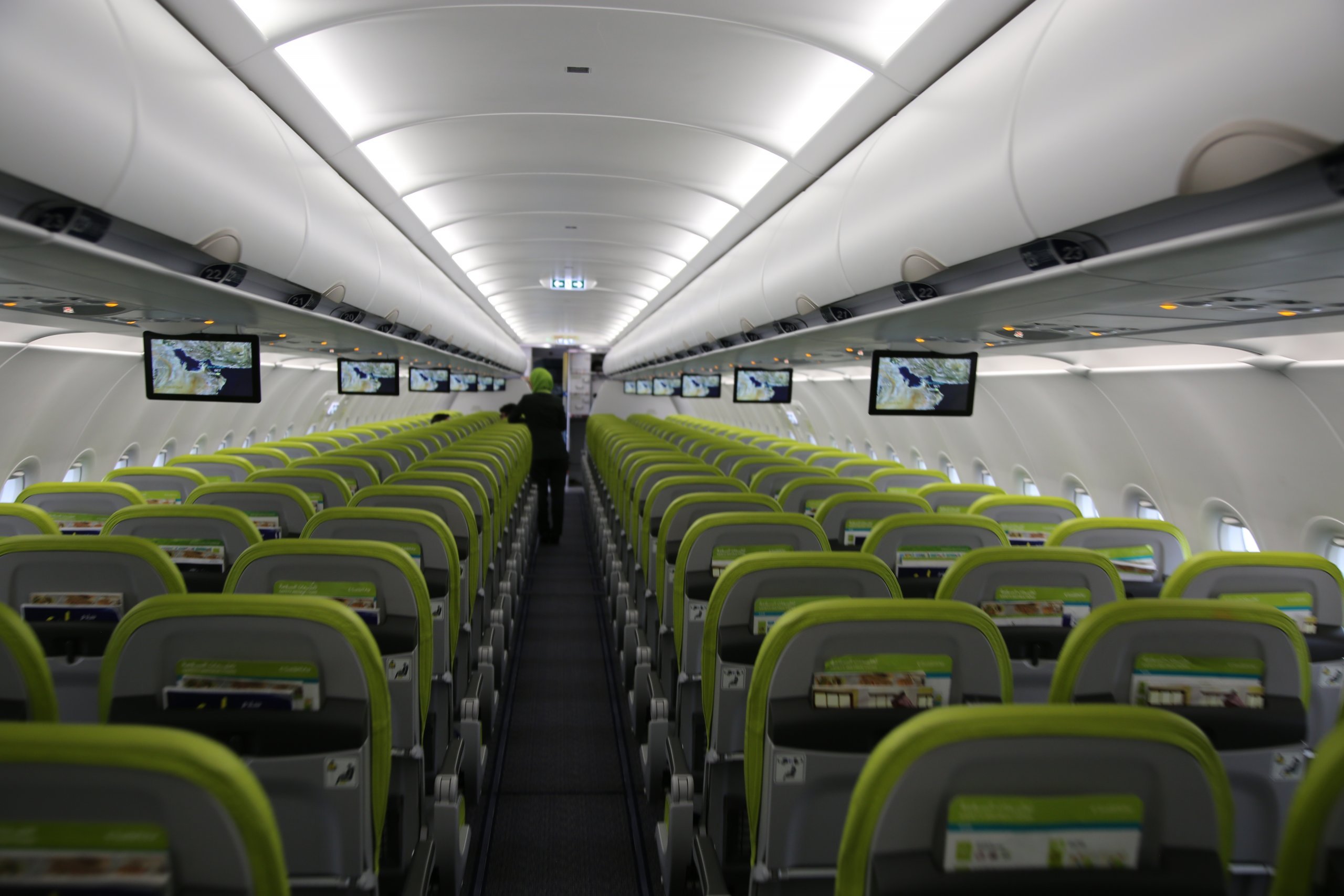Sæderne har ikke individuelle skærme, og der er kun nogle få fælles skærme, som viser flyveplanen under flyvningen.